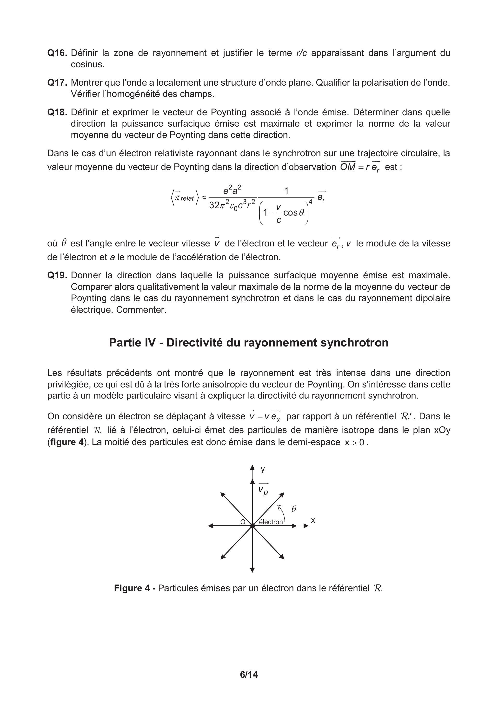 Q19. Donner la direction dans laquelle la puissance surfacique moyenne émise est maximale. Comparer alors qualitativement la valeur maximale de la norme de la moyenne du vecteur de Poynting dans le cas du rayonnement synchrotron et dans le cas du rayonnement dipolaire électrique. Commenter.