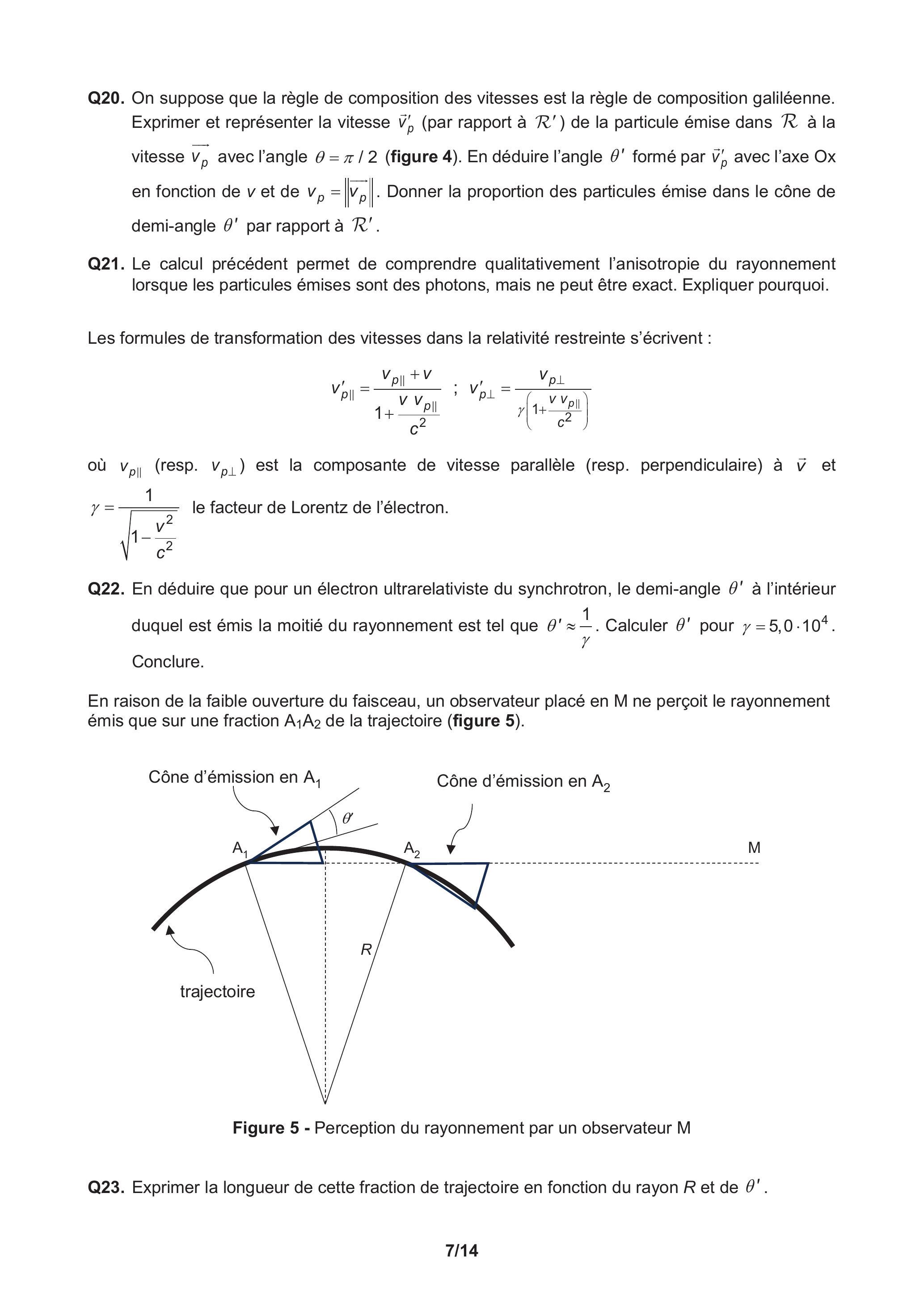Q22. En déduire que pour un électron ultrarelativiste du synchrotron, le demi-angle à l'intérieur duquel est émis la moitié du rayonnement est tel que . Calculer pour . Conclure.