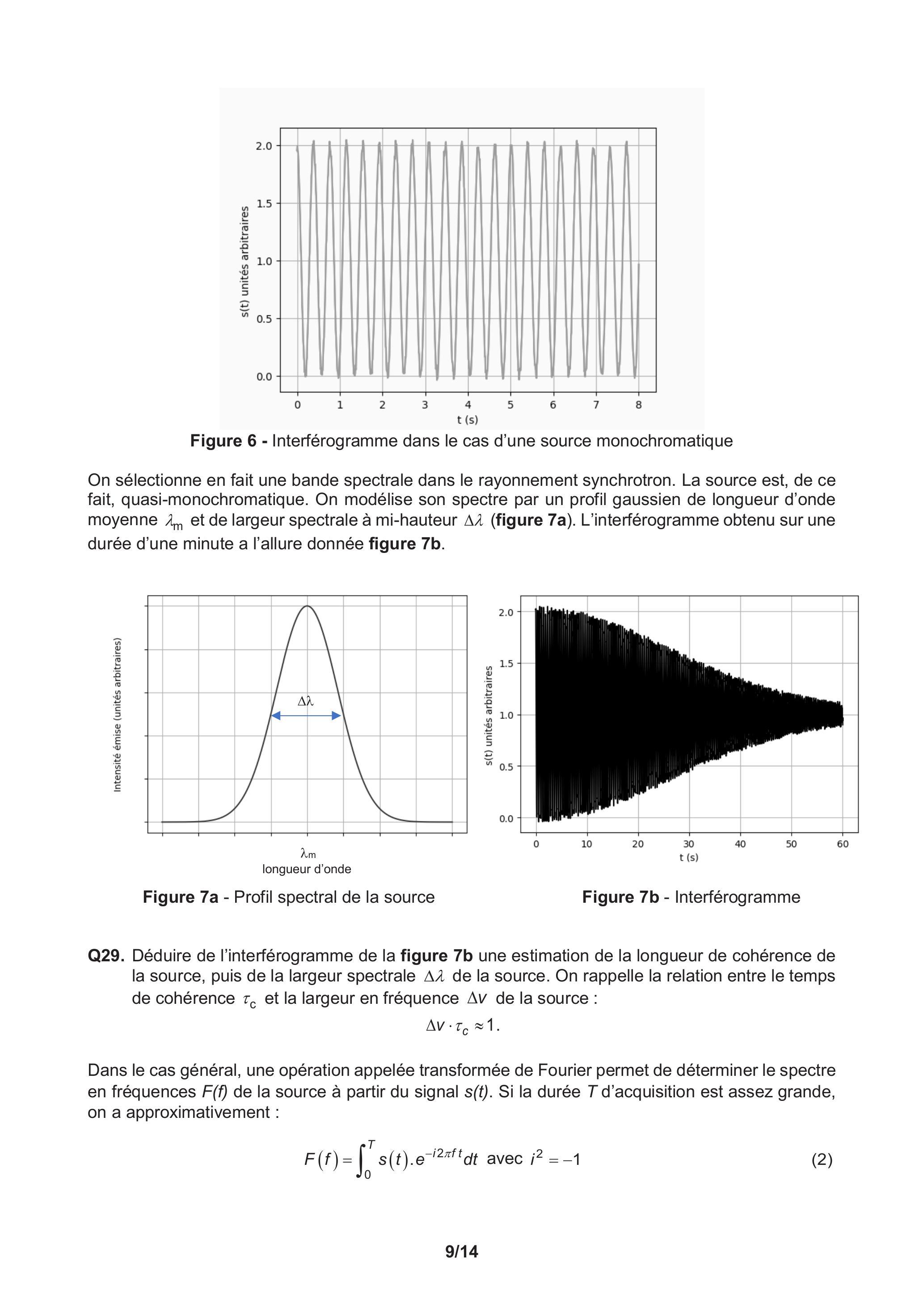 Q29. Déduire de l'interférogramme de la figure 7b une estimation de la longueur de cohérence de la source, puis de la largeur spectrale de la source. On rappelle la relation entre le temps de cohérence et la largeur en fréquence de la source :