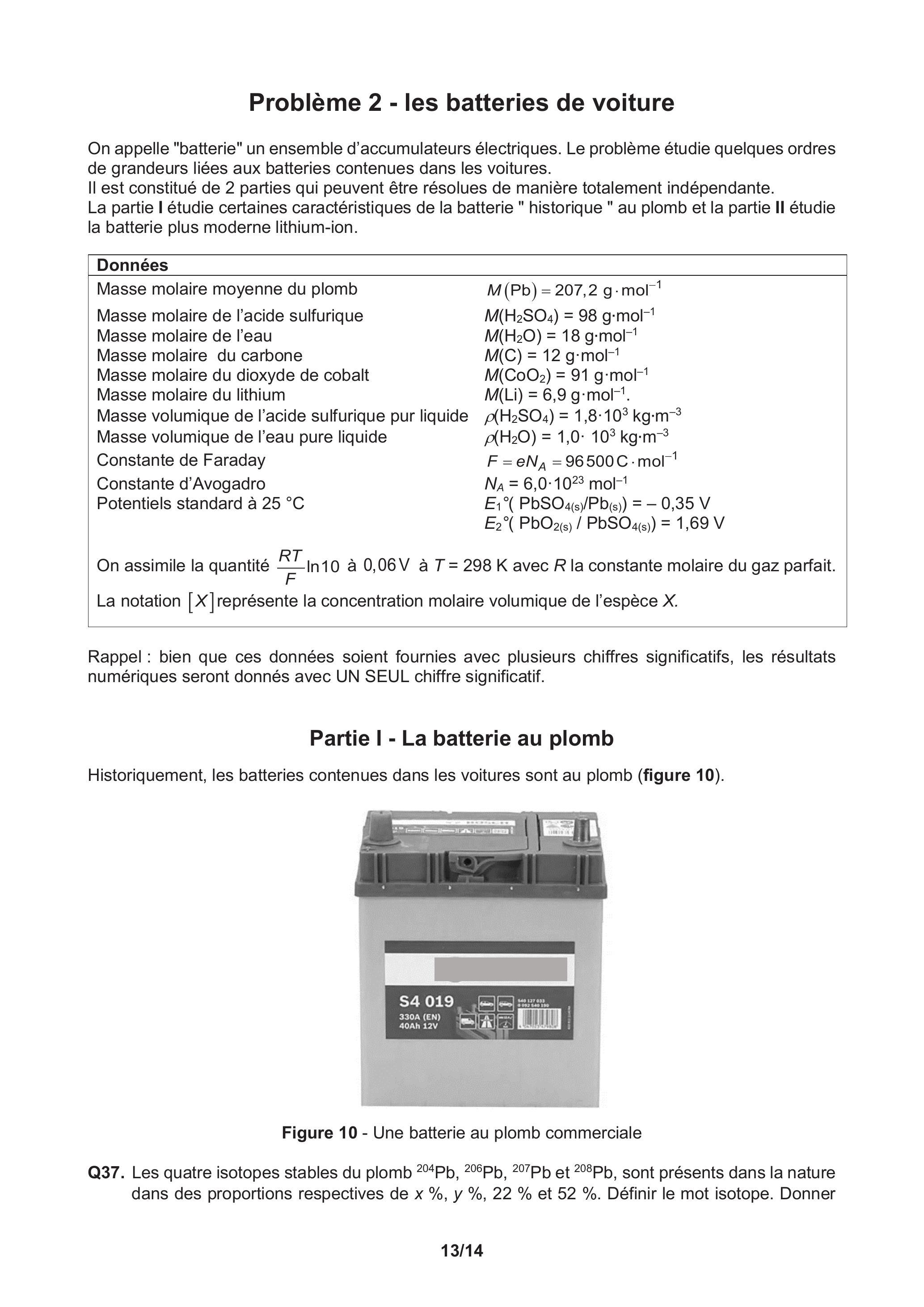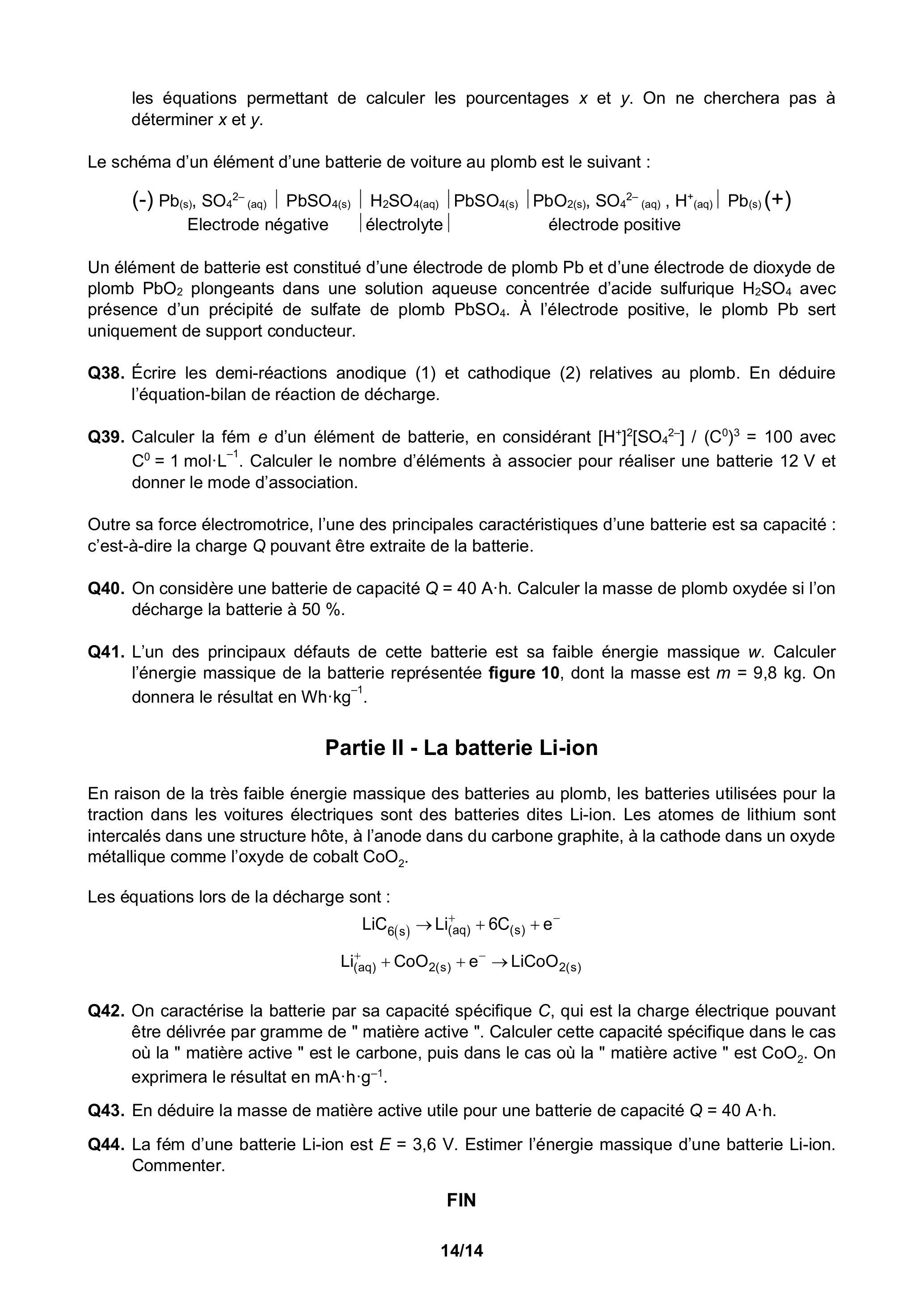 Q40. On considère une batterie de capacité . Calculer la masse de plomb oxydée si l'on décharge la batterie à .