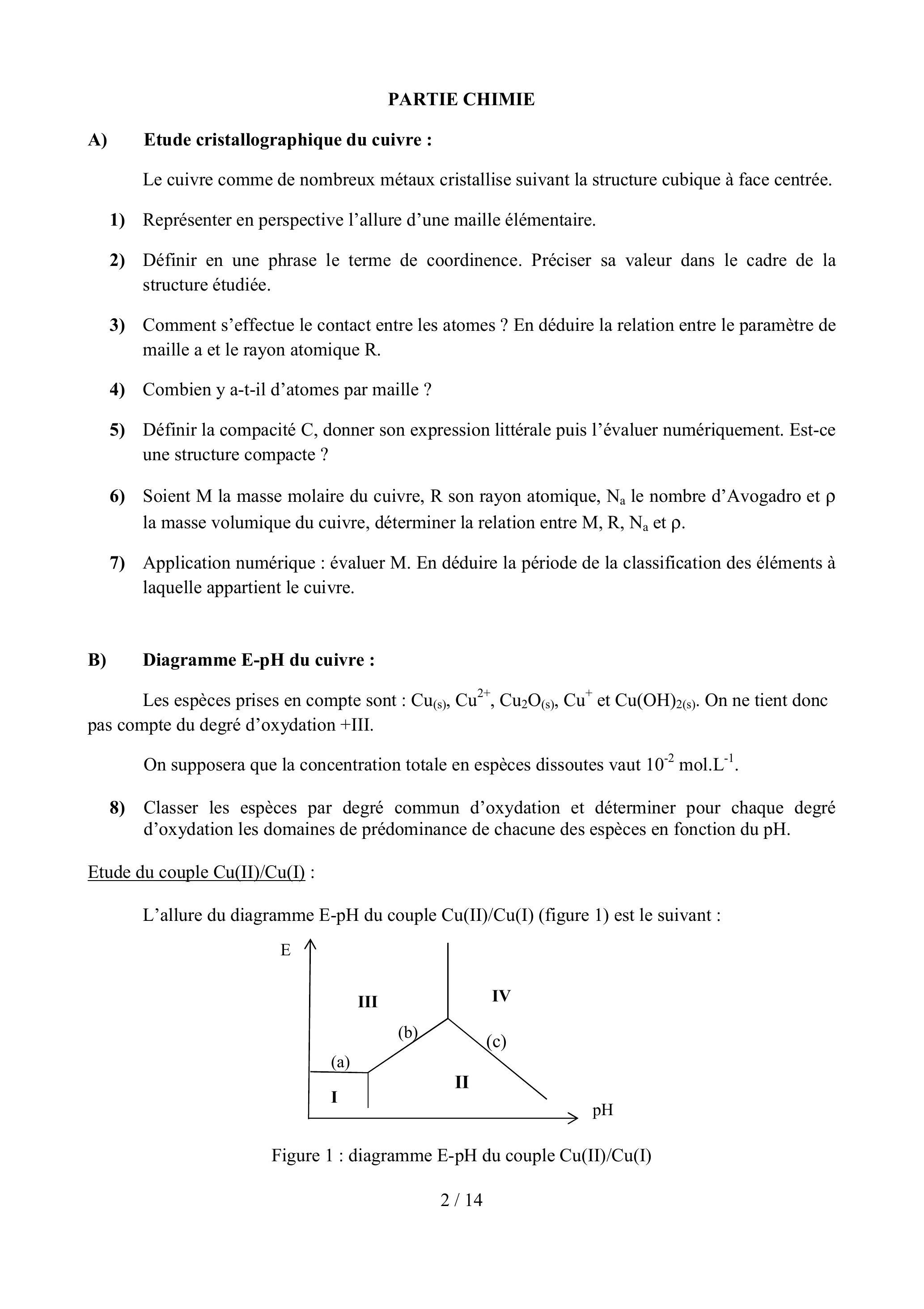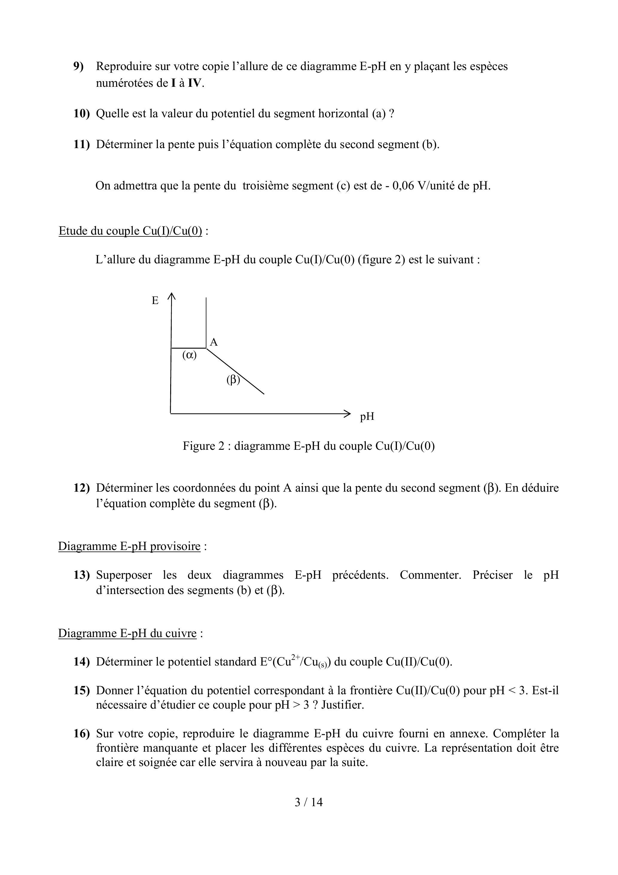 Une annexe donnant le diagramme E-pH du cuivre, des données et un formulaire global se trouve en fin d'énoncé en pages 13 et 14.