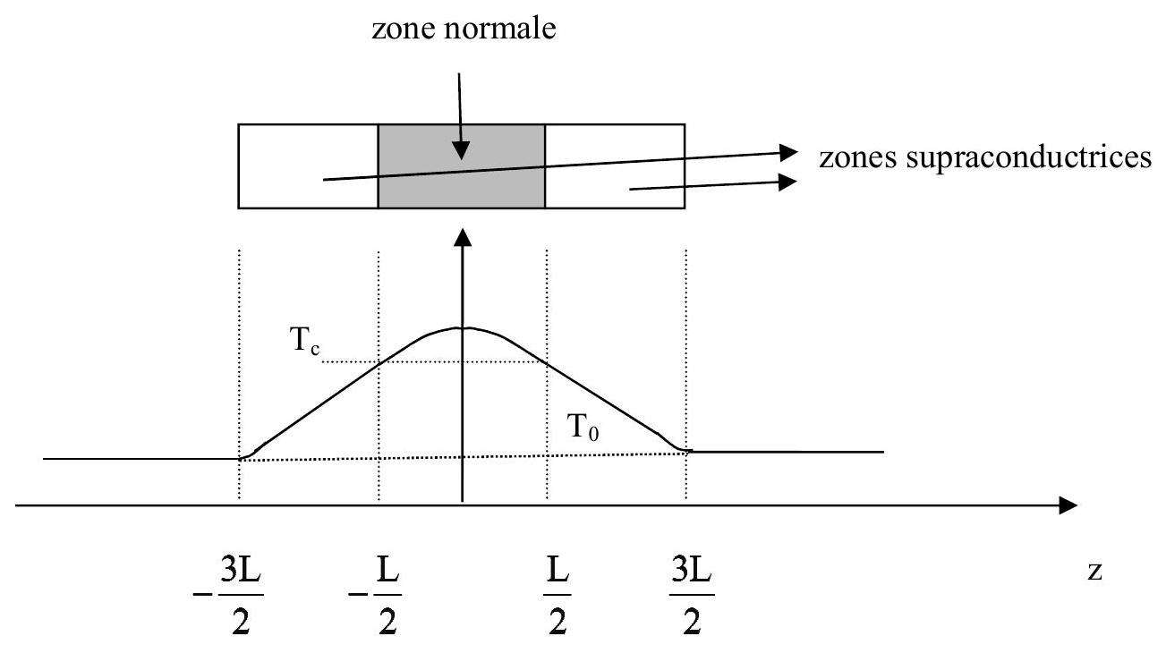 sa résistivité électrique. Le reste du conducteur est à l'état supraconducteur et est donc dépourvu de toute résistivité électrique. On suppose que le profil de température de part et d'autre de cette zone normale est le suivant :