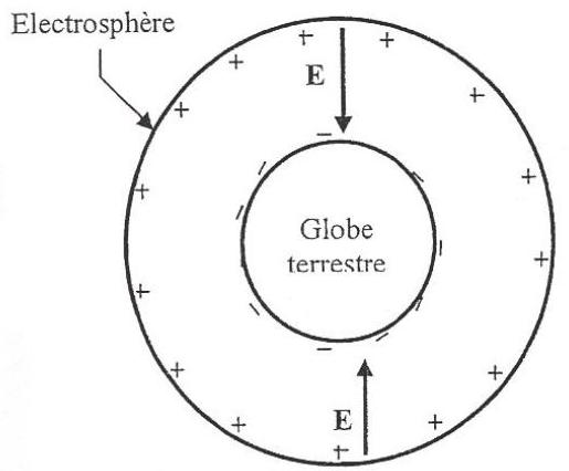 L'électrosphère est une couche atmosphérique ionisée. L'électrosphère et la Terre, de rayon R = 6370 km , forment un gigantesque condensateur terrestre (figure 1), où le champ électrique par beau temps est dirigé de l'électrosphère vers la Terre et atteint environ 100 à 120 V.m.
