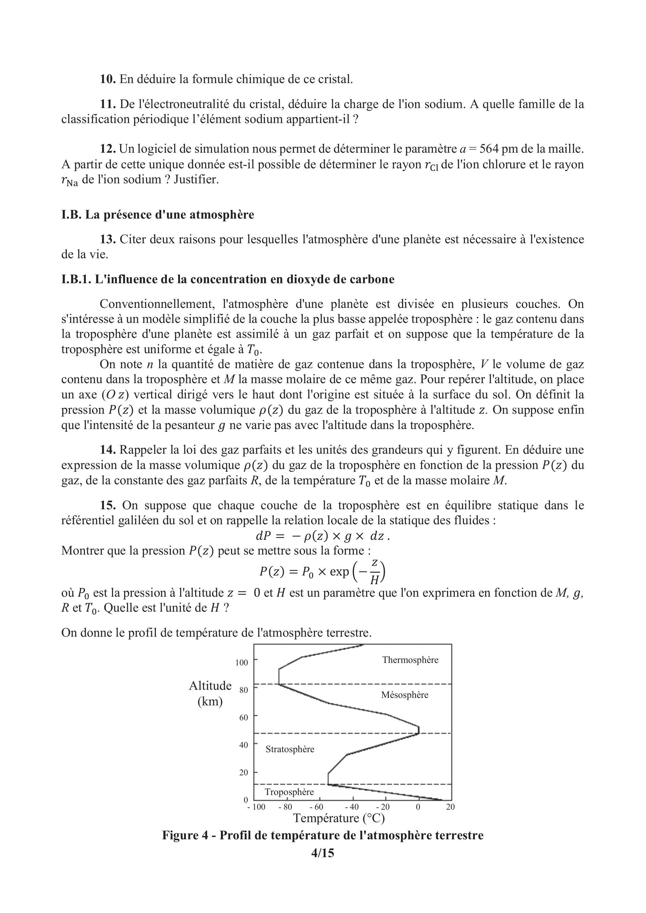 Conventionnellement, l'atmosphère d'une planète est divisée en plusieurs couches. On s'intéresse à un modèle simplifié de la couche la plus basse appelée troposphère : le gaz contenu dans la troposphère d'une planète est assimilé à un gaz parfait et on suppose que la température de la troposphère est uniforme et égale à .