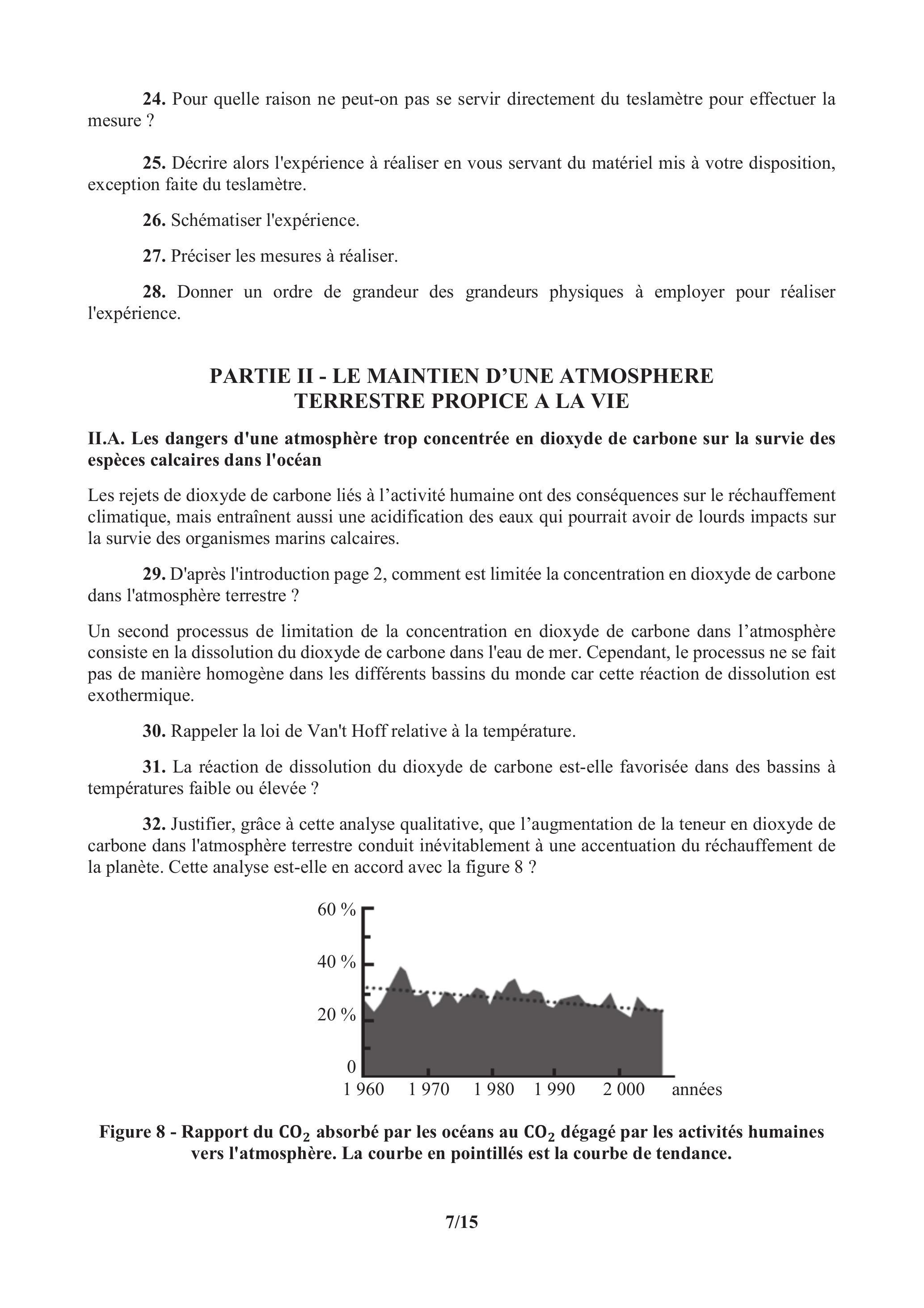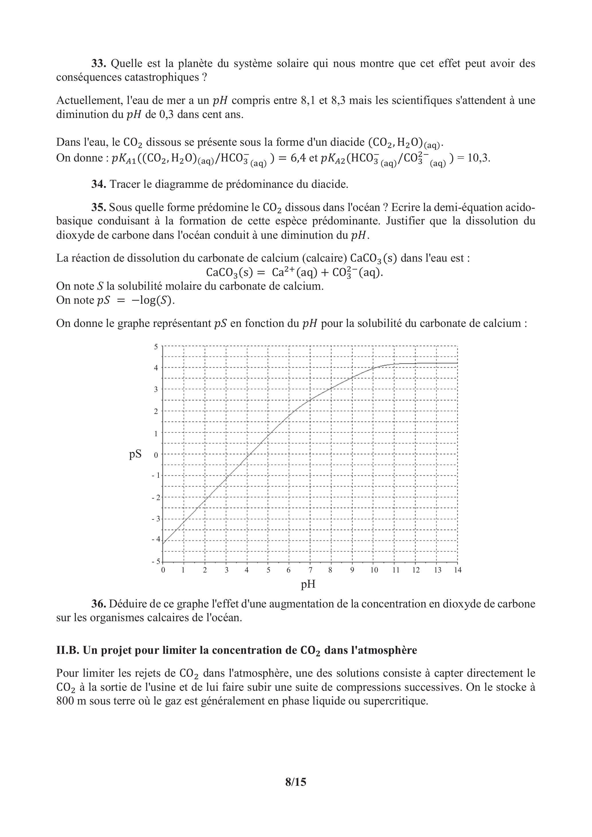 35. Sous quelle forme prédomine le dissous dans l'océan ? Ecrire la demi-équation acidobasique conduisant à la formation de cette espèce prédominante. Justifier que la dissolution du dioxyde de carbone dans l'océan conduit à une diminution du .