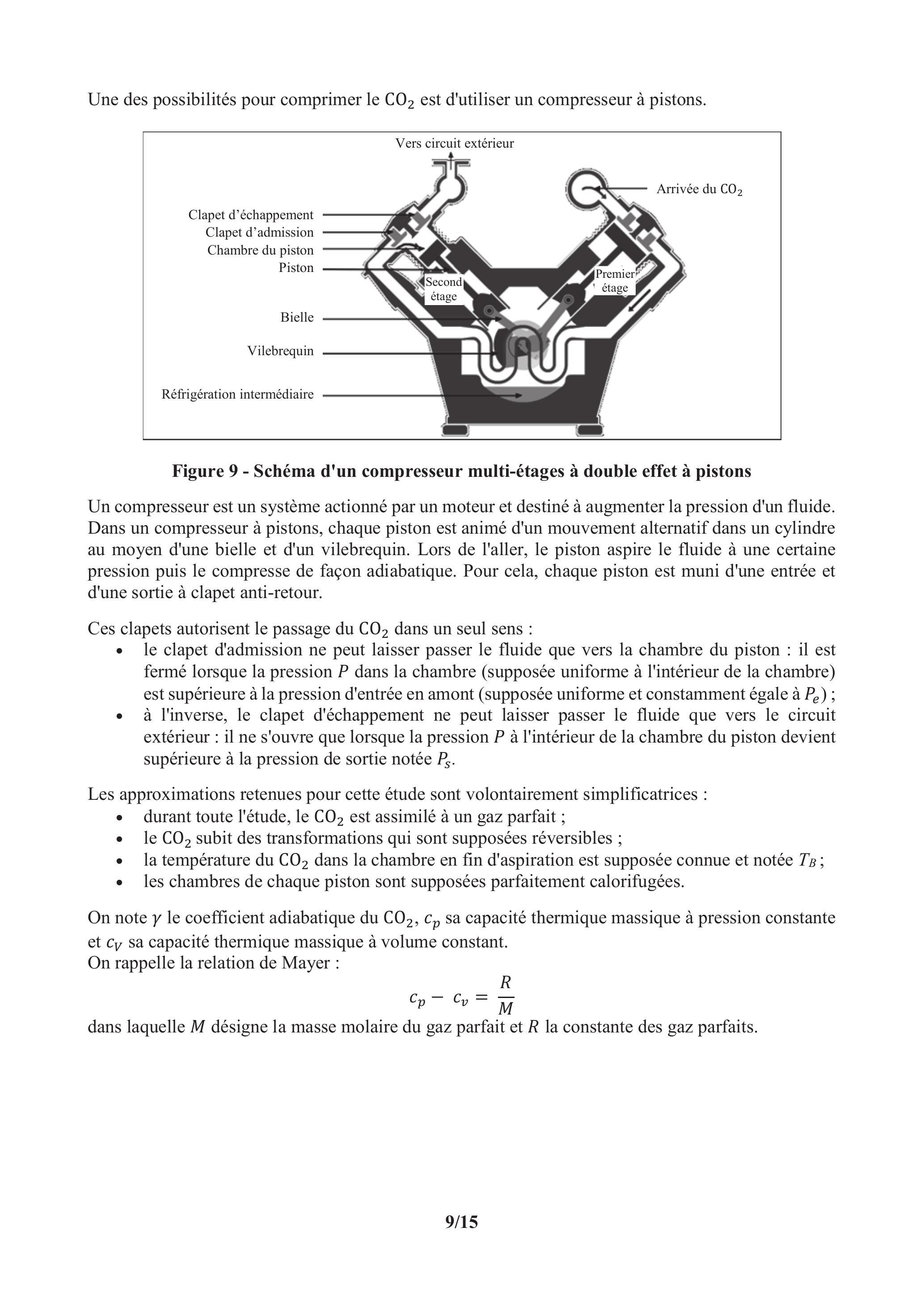 Un compresseur est un système actionné par un moteur et destiné à augmenter la pression d'un fluide. Dans un compresseur à pistons, chaque piston est animé d'un mouvement alternatif dans un cylindre au moyen d'une bielle et d'un vilebrequin. Lors de l'aller, le piston aspire le fluide à une certaine pression puis le compresse de façon adiabatique. Pour cela, chaque piston est muni d'une entrée et d'une sortie à clapet anti-retour.
