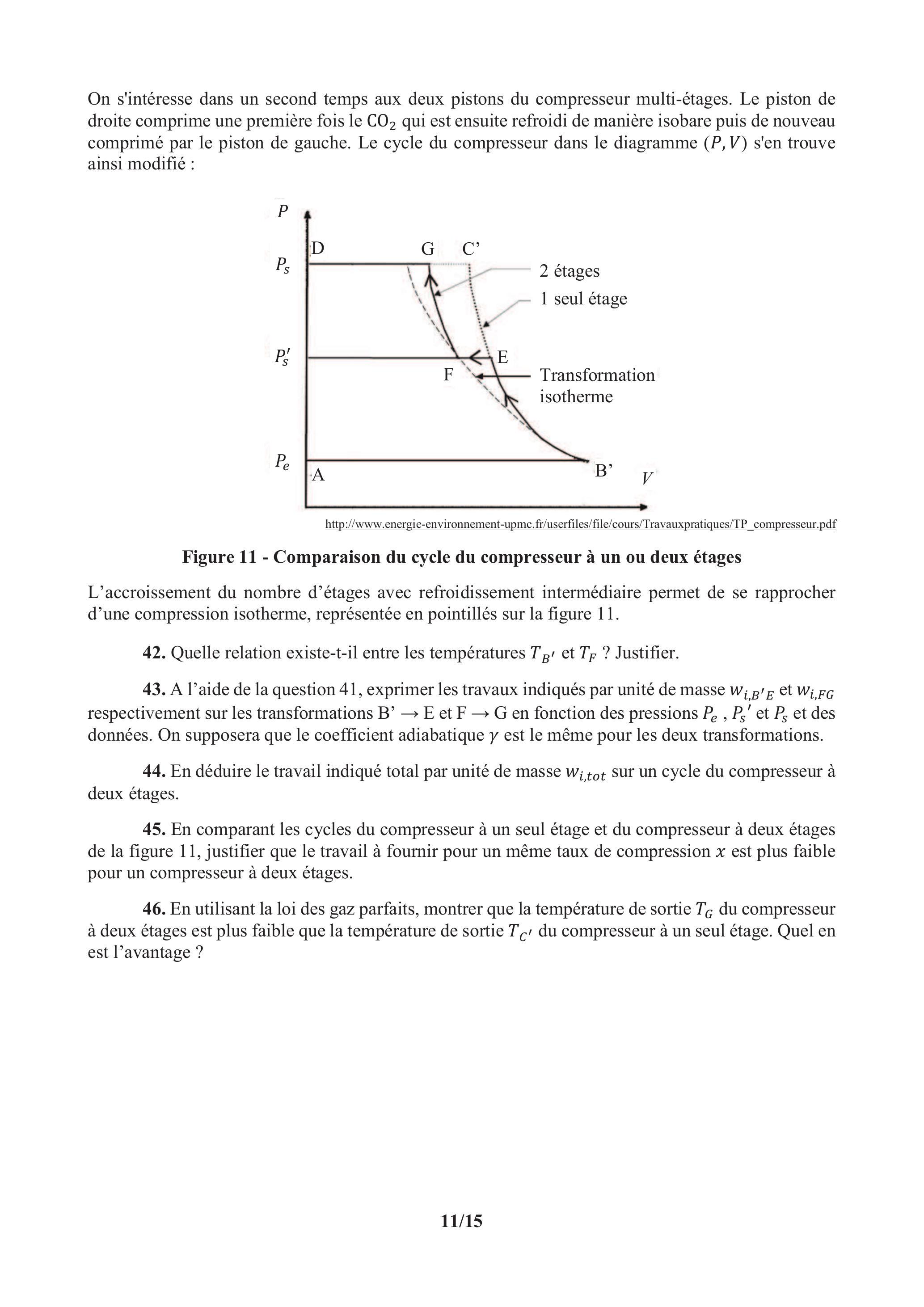 45. En comparant les cycles du compresseur à un seul étage et du compresseur à deux étages de la figure 11, justifier que le travail à fournir pour un même taux de compression est plus faible pour un compresseur à deux étages.