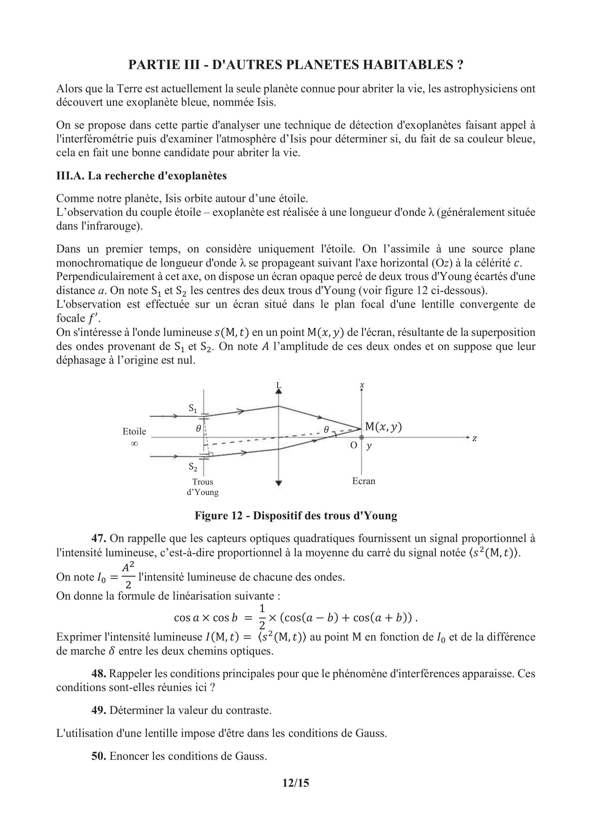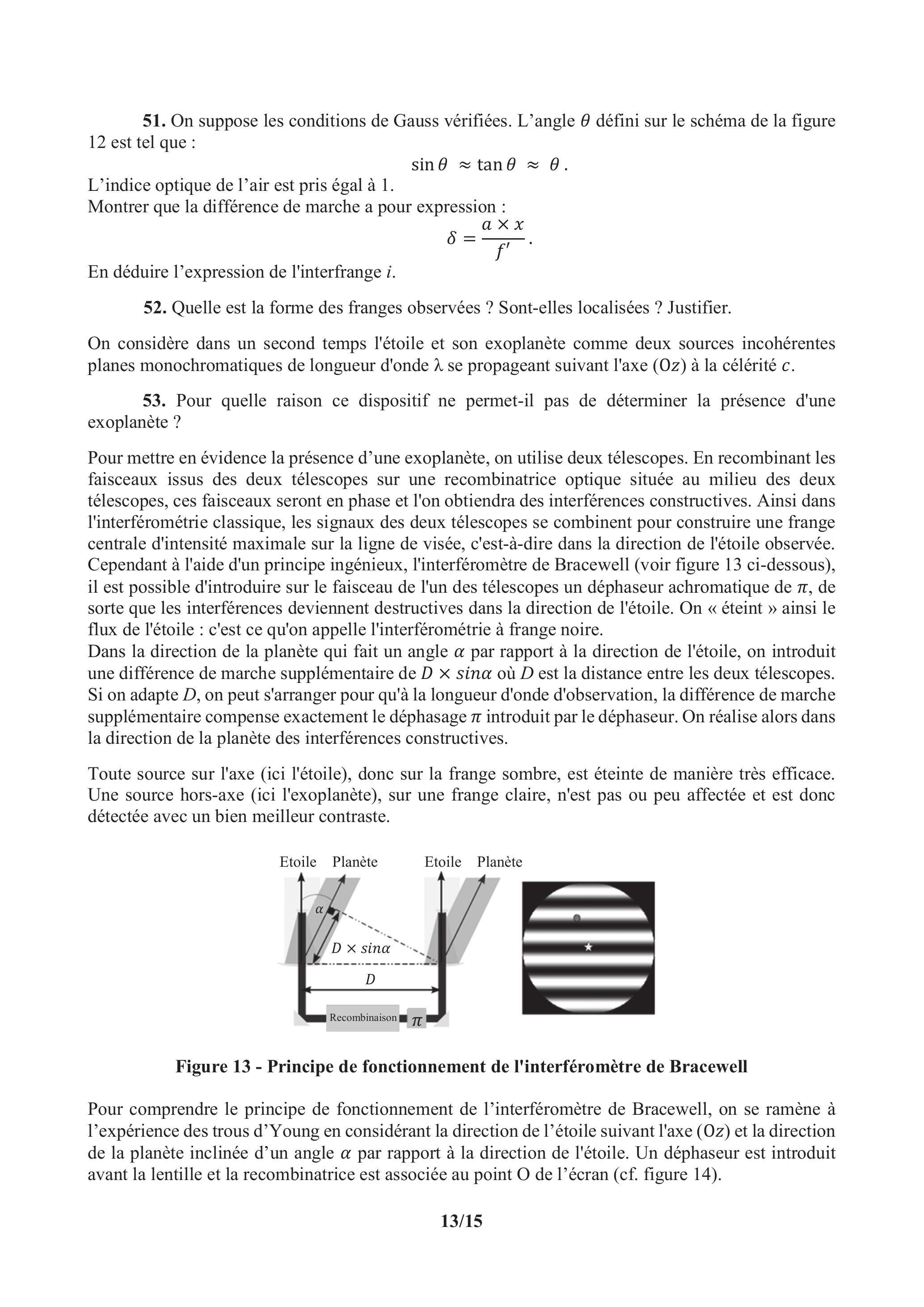 On considère dans un second temps l'étoile et son exoplanète comme deux sources incohérentes planes monochromatiques de longueur d'onde se propageant suivant l'axe ( ) à la célérité .