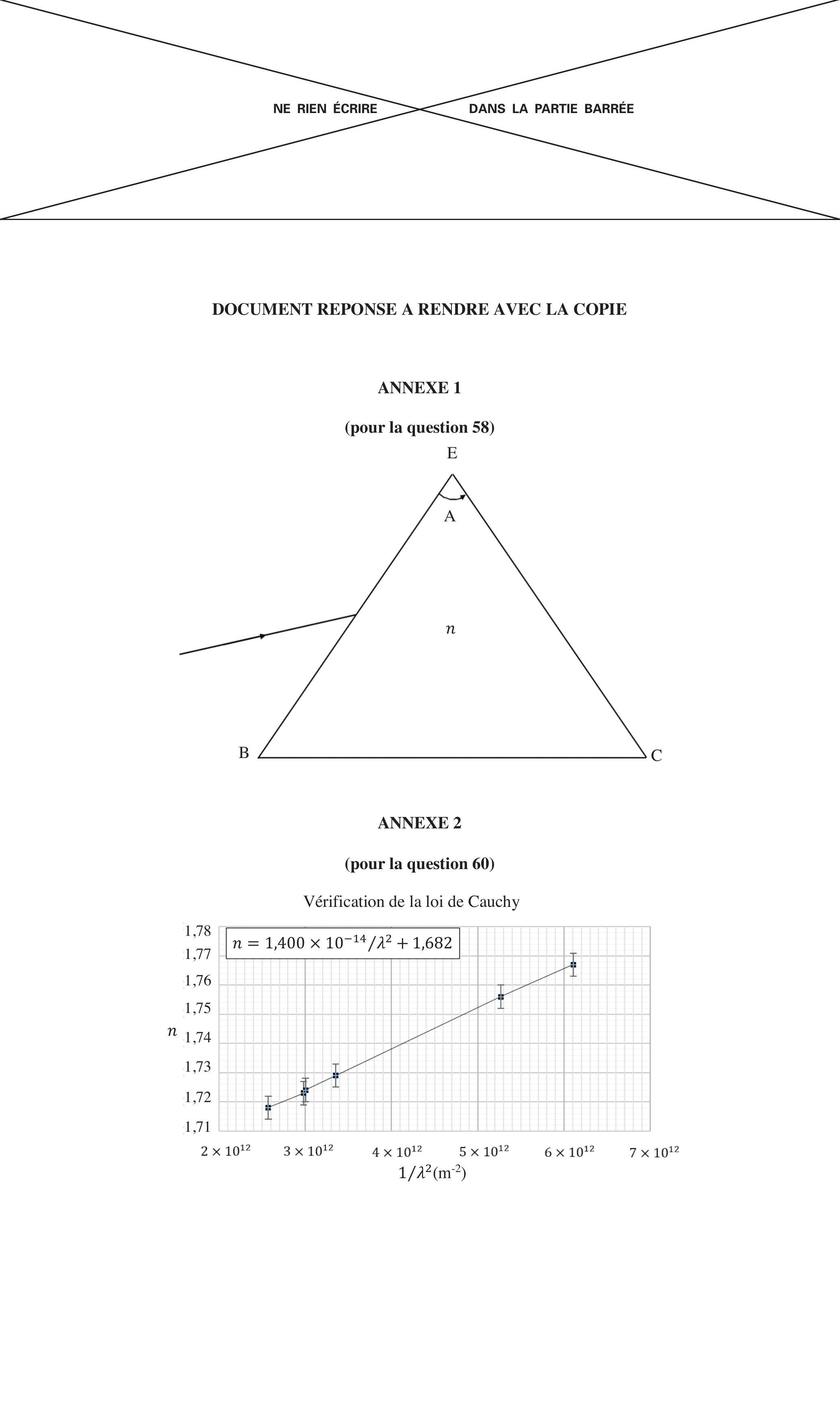 En éclairant le prisme avec une lampe à mercure dont on connaît les longueurs d'onde des raies d'émission, on peut vérifier que l'indice optique du prisme dépend de la longueur d'onde de la raie : cette loi est appelée loi de Cauchy. Pour vérifier cette loi, on a tracé en laboratoire la courbe donnée sur le document réponse.