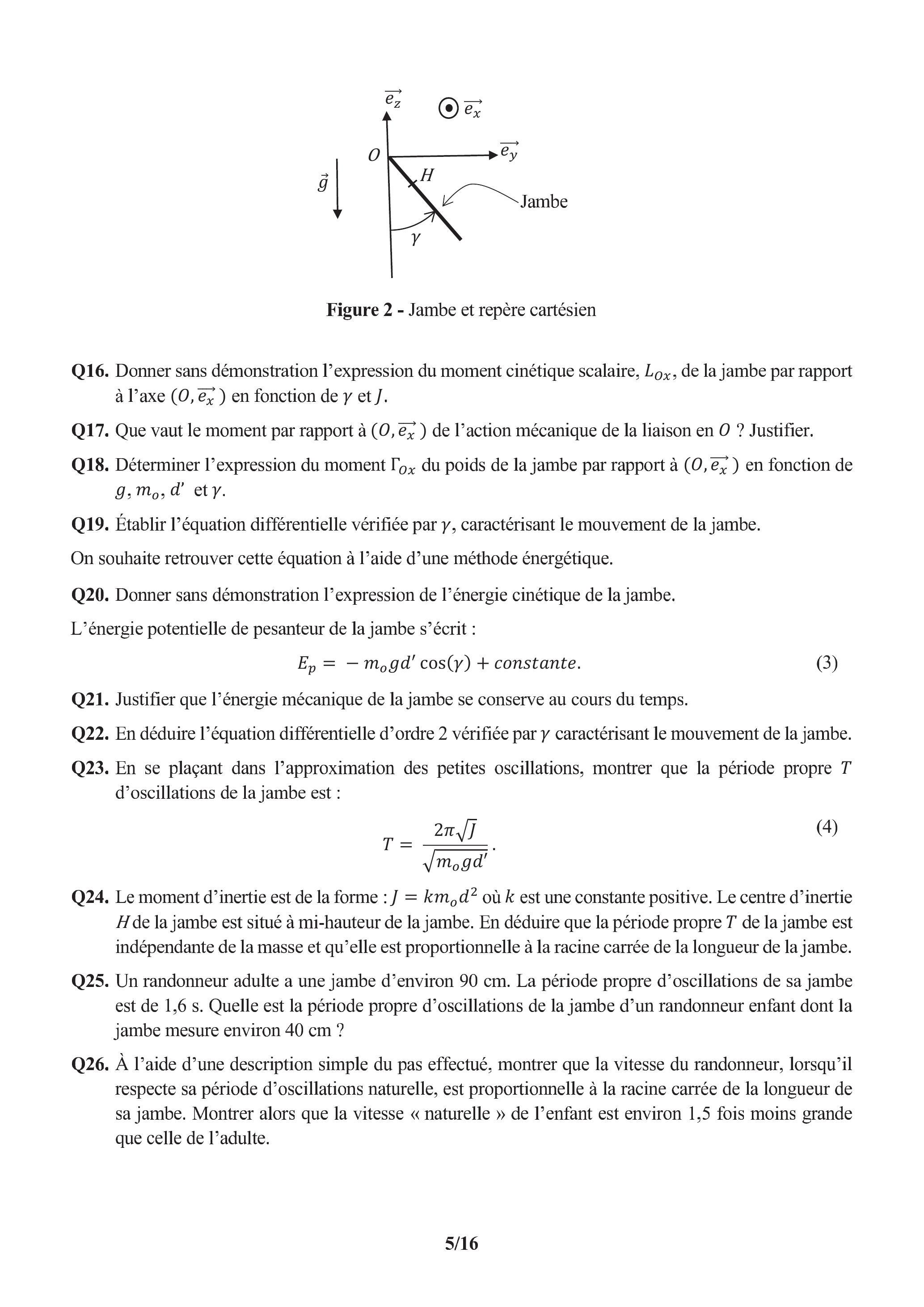 Q24. Le moment d'inertie est de la forme: où est une constante positive. Le centre d'inertie de la jambe est situé à mi-hauteur de la jambe. En déduire que la période propre de la jambe est indépendante de la masse et qu'elle est proportionnelle à la racine carrée de la longueur de la jambe.