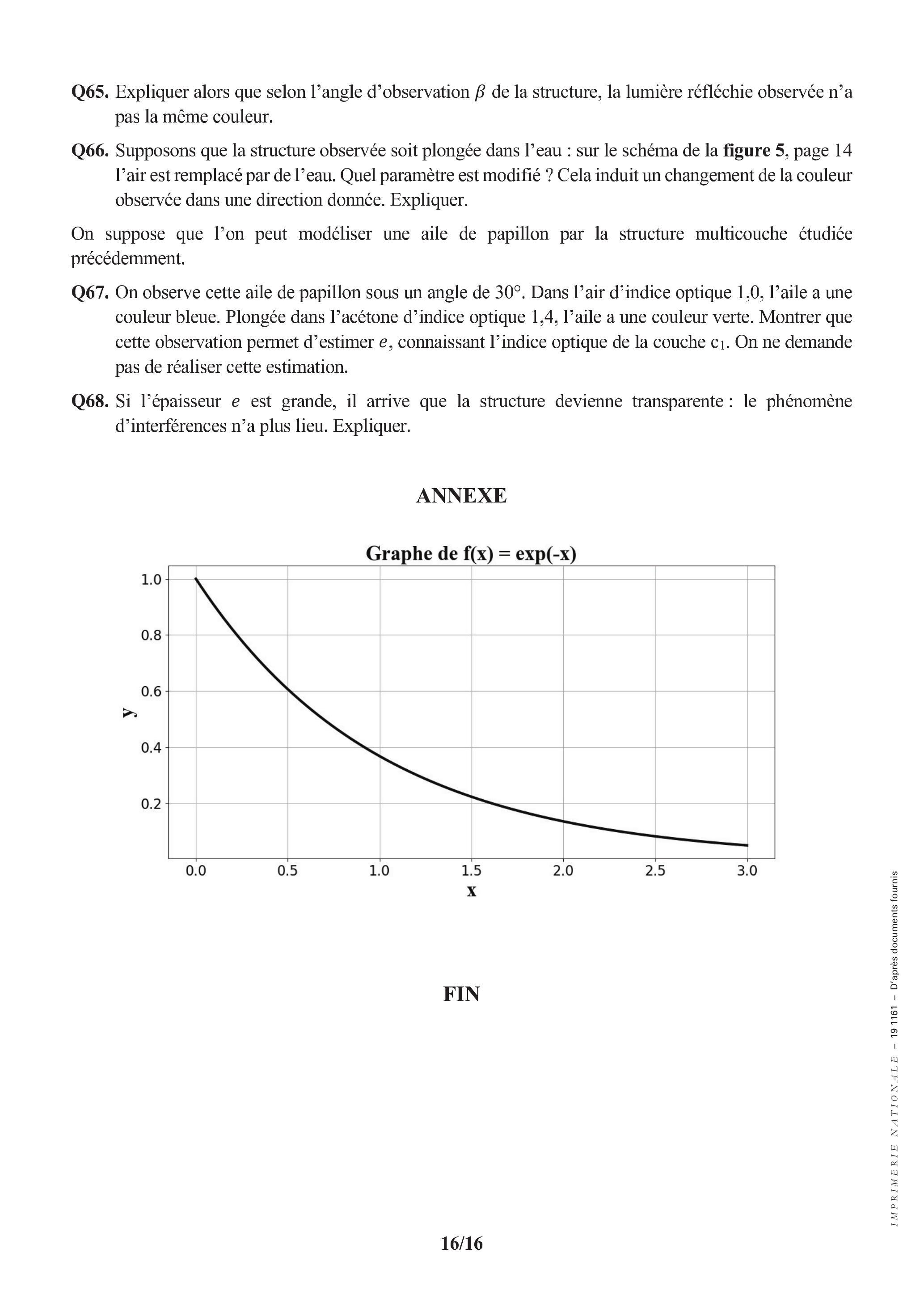 Q67. On observe cette aile de papillon sous un angle de . Dans l'air d'indice optique 1,0 , l'aile a une couleur bleue. Plongée dans l'acétone d'indice optique 1,4, l'aile a une couleur verte. Montrer que cette observation permet d'estimer , connaissant l'indice optique de la couche . On ne demande pas de réaliser cette estimation.