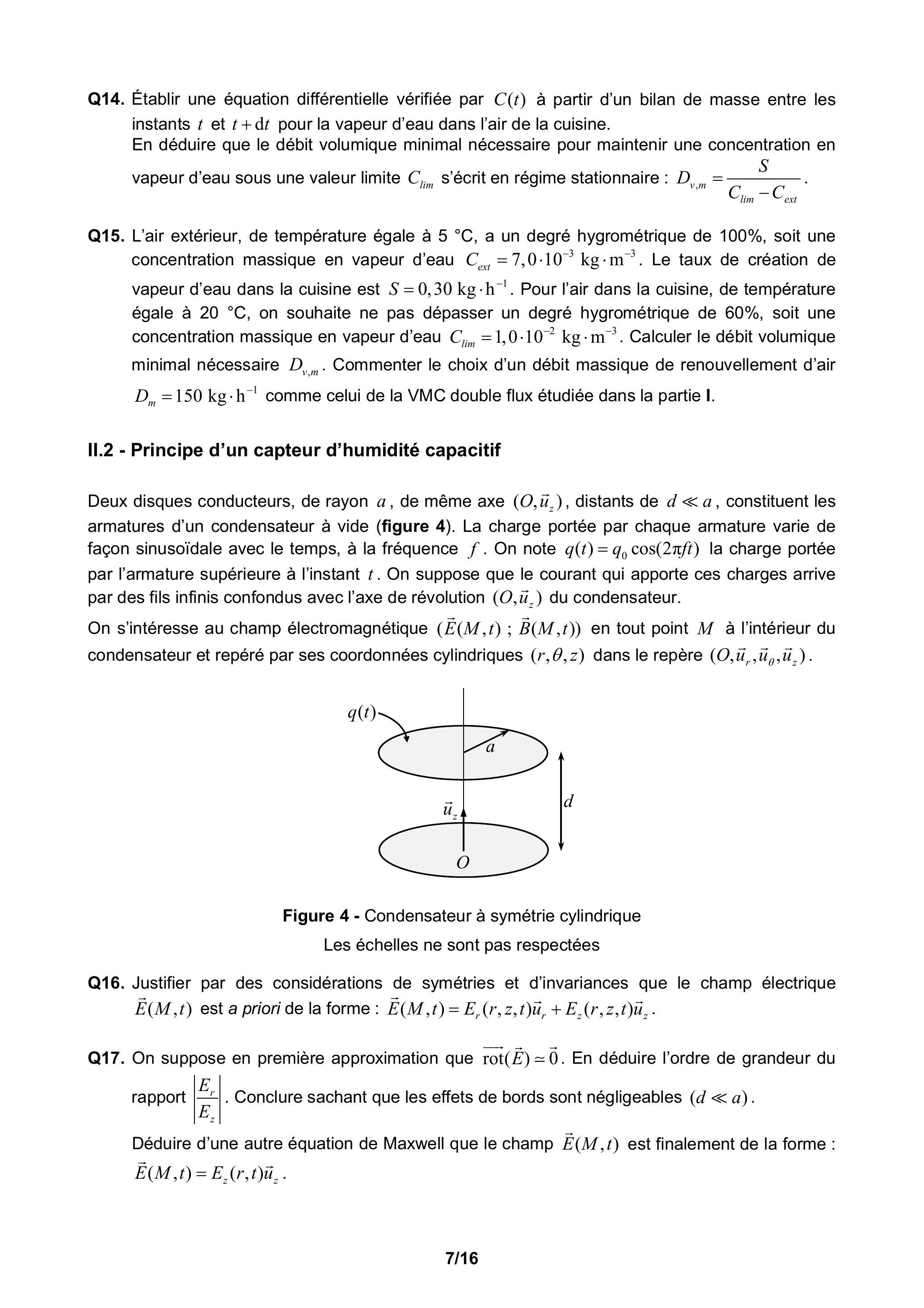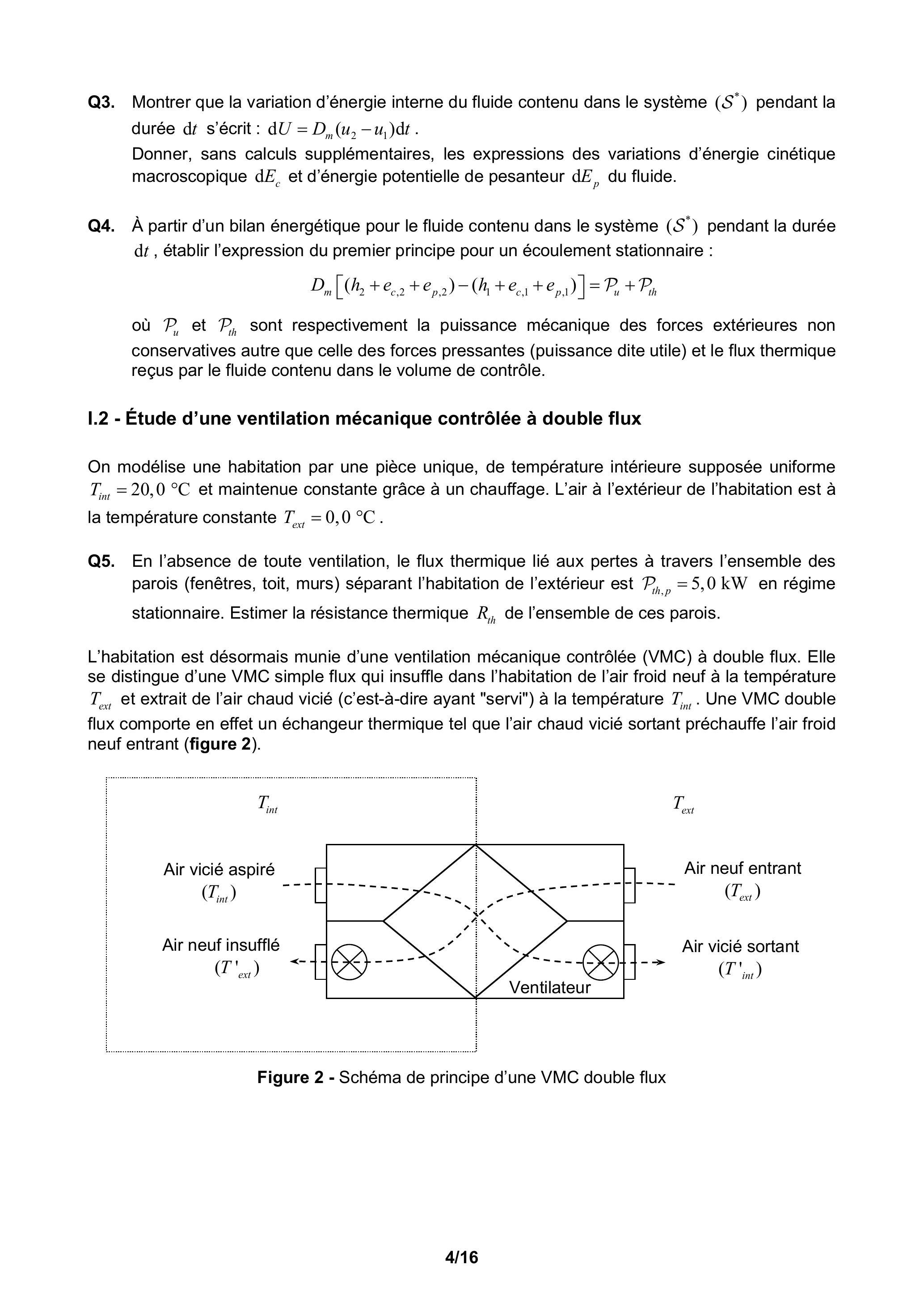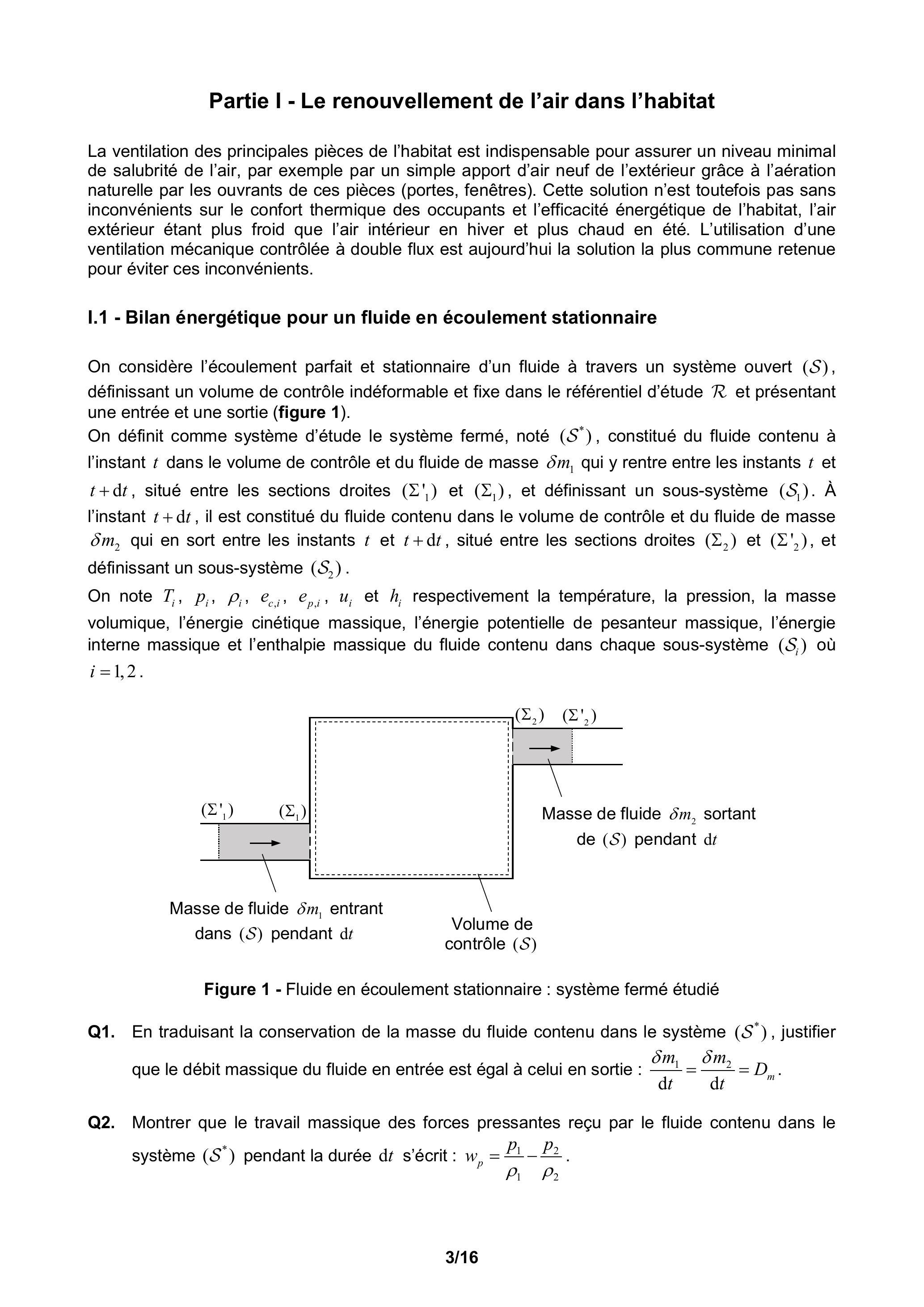 On étudiera ainsi dans la partie I un système de ventilation mécanique visant à renouveler l'air dans l'habitat. On réalisera dans la sous-partie un bilan général d'énergie pour un fluide en écoulement stationnaire, avant d'analyser le principe d'une ventilation mécanique contrôlée à double flux en sous-partie I.2. Dans la partie II, on s'intéressera à l'humidité de l'air dans l'habitat avec quelques généralités sur l'air humide en sous-partie II.1, puis la description du fonctionnement d'un hygromètre capacitif en sous-partie ll.2. Enfin, on abordera la problématique de la nuisance sonore liée aux systèmes de renouvellement d'air dans la partie III. On détaillera à cet effet le principe de la correction acoustique d'une pièce d'habitation en sous-partie III.1, puis celui d'un silencieux à résonateur de Helmholtz en sous-partie III.2.