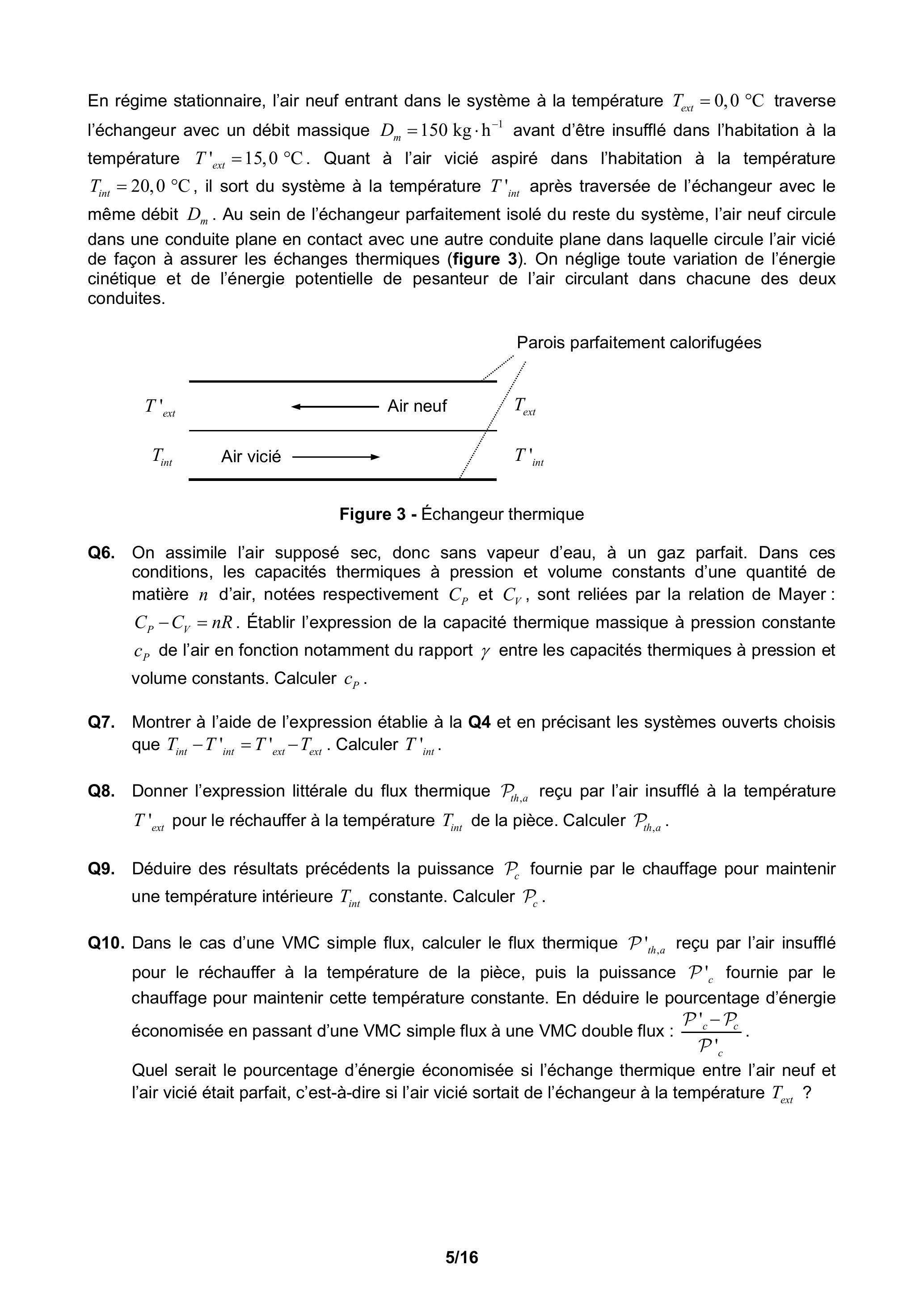 Q10. Dans le cas d'une VMC simple flux, calculer le flux thermique reçu par l'air insufflé pour le réchauffer à la température de la pièce, puis la puissance fournie par le chauffage pour maintenir cette température constante. En déduire le pourcentage d'énergie économisée en passant d'une VMC simple flux à une VMC double flux : .