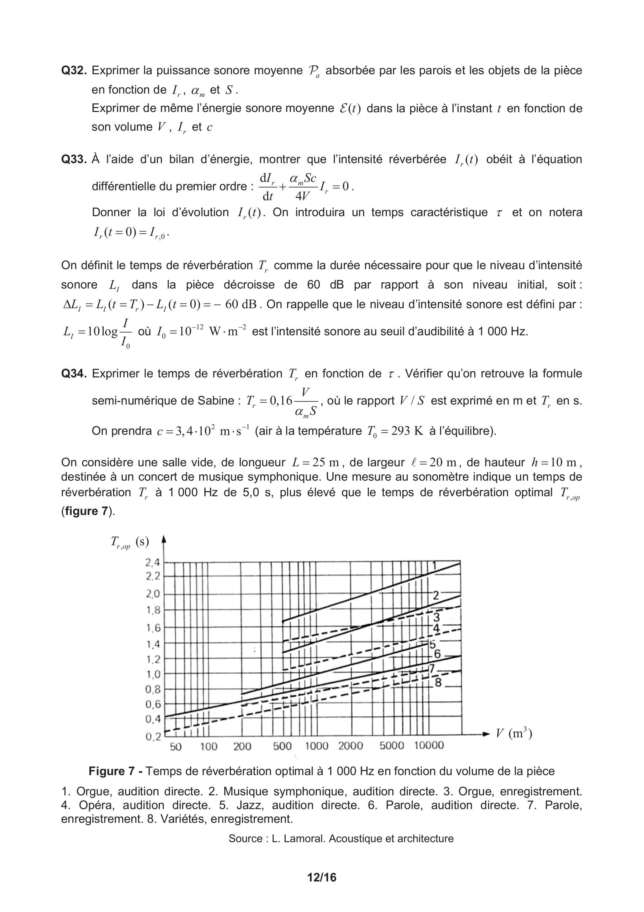 Q34. Exprimer le temps de réverbération en fonction de . Vérifier qu'on retrouve la formule semi-numérique de Sabine : , où le rapport est exprimé en m et en s . On prendra (air à la température à l'équilibre).