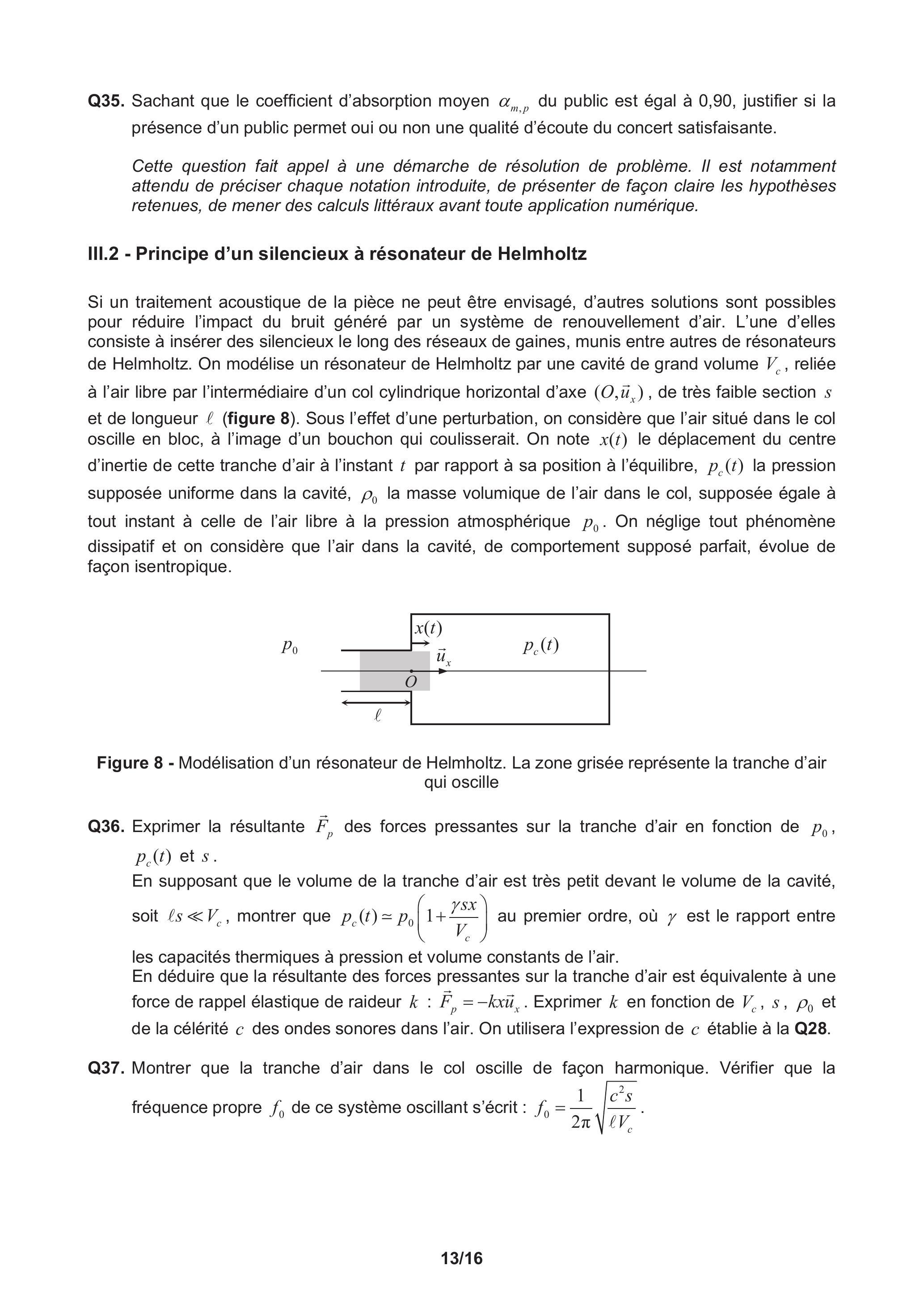 Q37. Montrer que la tranche d'air dans le col oscille de façon harmonique. Vérifier que la fréquence propre de ce système oscillant s'écrit : .