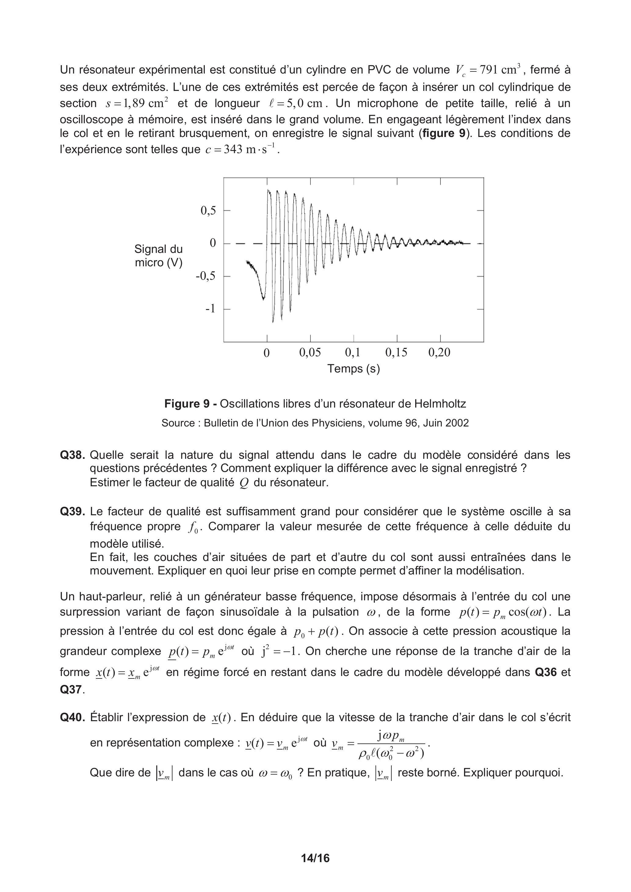 Un résonateur expérimental est constitué d'un cylindre en PVC de volume , fermé à ses deux extrémités. L'une de ces extrémités est percée de façon à insérer un col cylindrique de section et de longueur . Un microphone de petite taille, relié à un oscilloscope à mémoire, est inséré dans le grand volume. En engageant légèrement l'index dans le col et en le retirant brusquement, on enregistre le signal suivant (figure 9). Les conditions de l'expérience sont telles que .