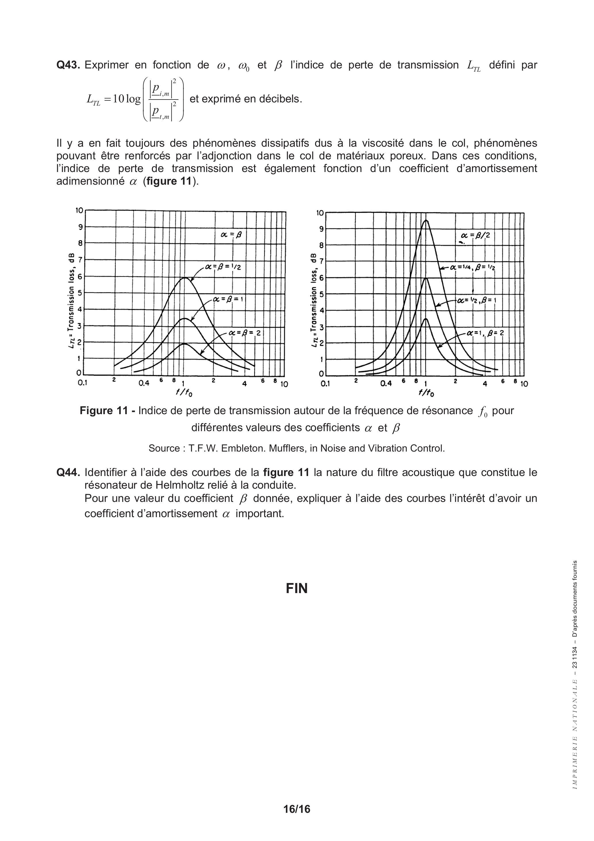 Q44. Identifier à l'aide des courbes de la figure 11 la nature du filtre acoustique que constitue le résonateur de Helmholtz relié à la conduite.