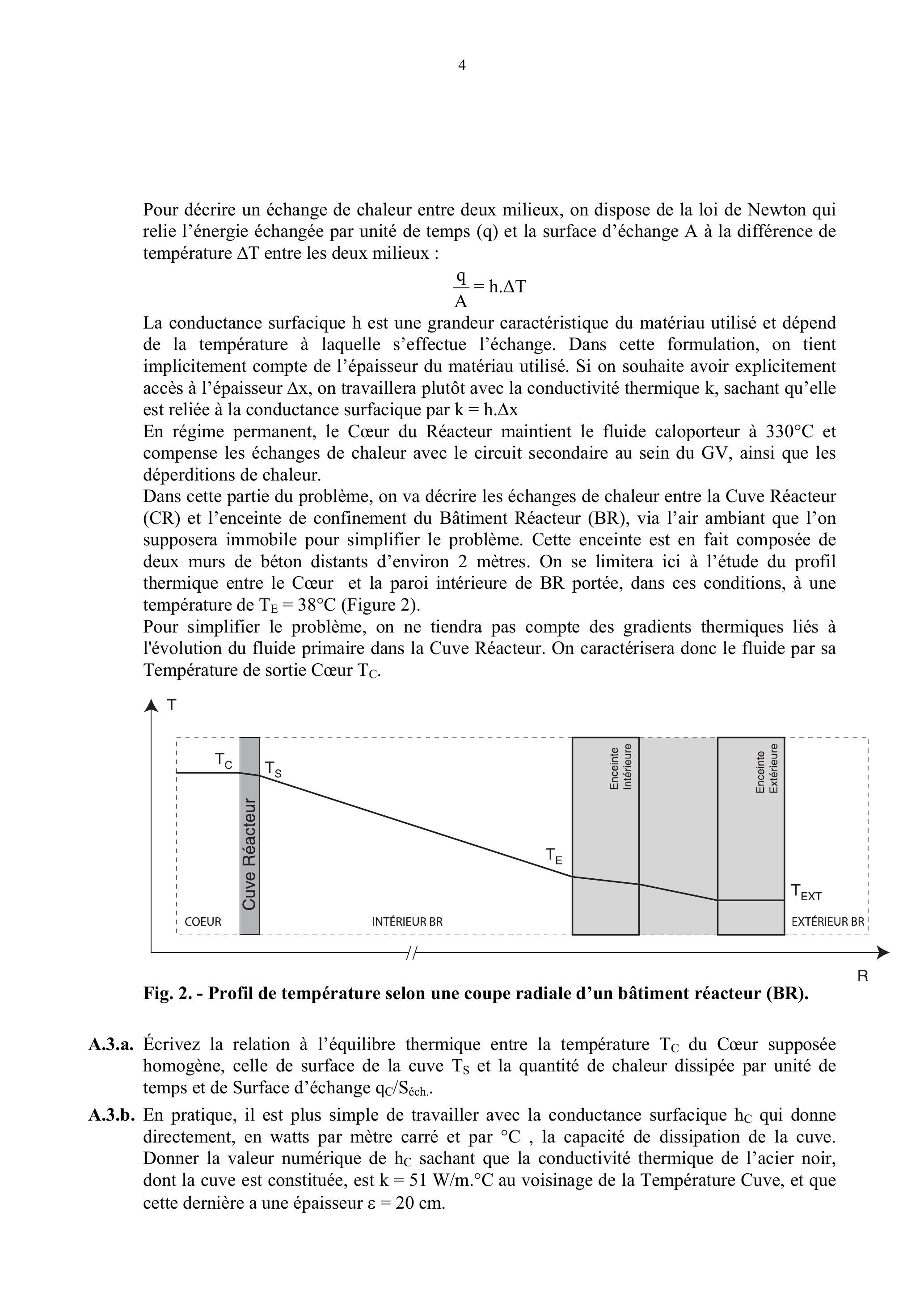 A.3.a. Écrivez la relation à l'équilibre thermique entre la température du Cœur supposée homogène, celle de surface de la cuve et la quantité de chaleur dissipée par unité de temps et de Surface d'échange é.