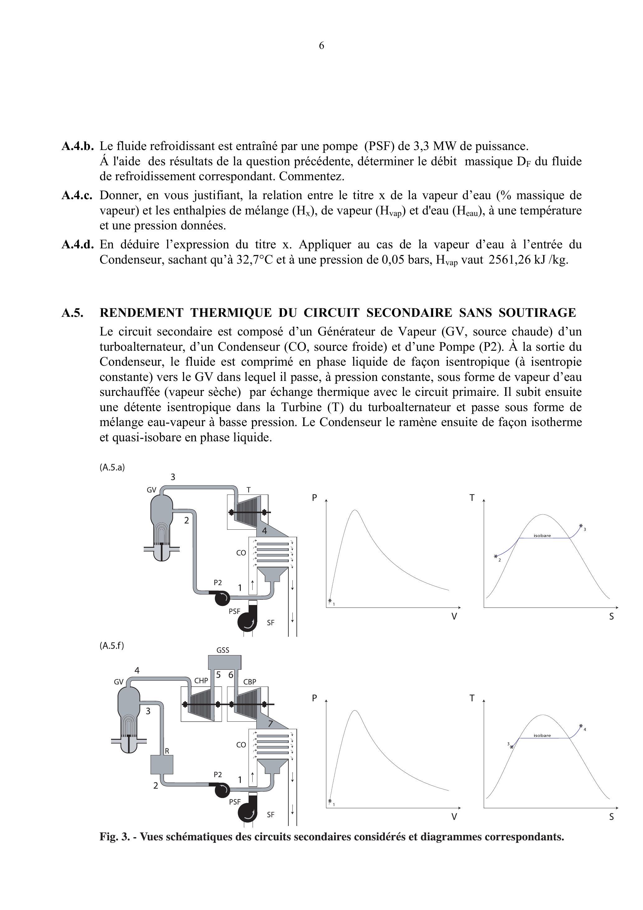 A.5.a. Représenter, sur les diagrammes et , fournis en Document-Réponse, le cycle décrit ci-dessus, correspondant à la partie haute de la Figure 3 (veillez à respecter les notations des points de mesure 1, 2, 3 et 4 du haut de la Figure 3, lors de leur report sur le papier). Notez que la courbe de saturation a été systématiquement représentée, que le point (1) [entrée Pompe secondaire P 2 ] est indiqué sur les diagrammes ( ) et que l'isobare correspondant au passage du Générateur de Vapeur (GV) est indiqué sur les diagrammes fournis. Il est conseillé de procéder en étudiant les variations des couples ( ) et (T,S) étape par étape. Il est rappelé que l'eau est incompressible et qu'il existe une loi simple pour les gaz que l'on supposera parfaits.