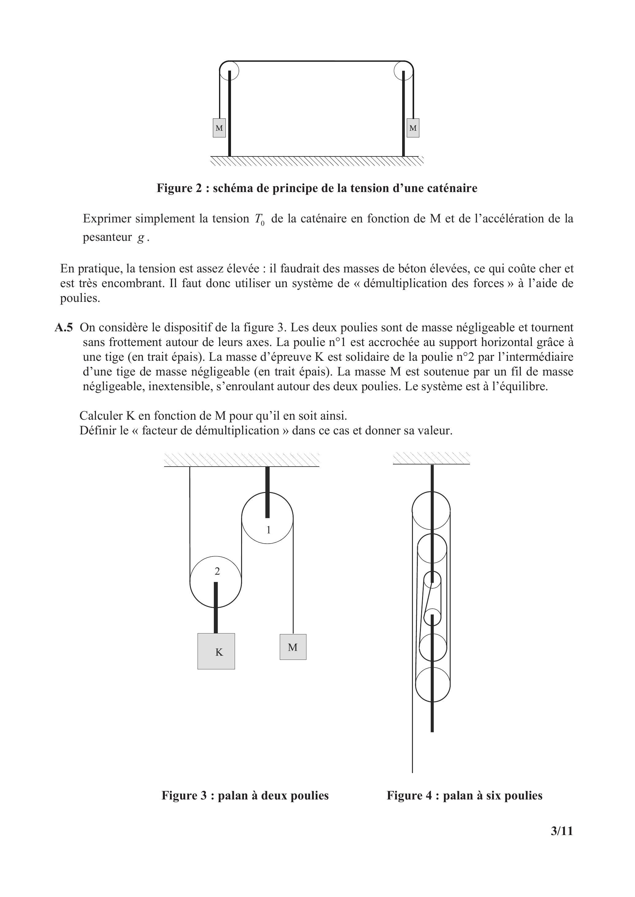 A. 4 Schématiquement, la caténaire est tendue entre deux poteaux par un ensemble de poids en béton identiques (chacun de masse M ) comme indiqué par la figure 2. Le câble est de masse négligeable devant les masses M et il est inextensible. Les poulies sont de masse négligeable et peuvent tourner sans frottement autour de leurs axes.