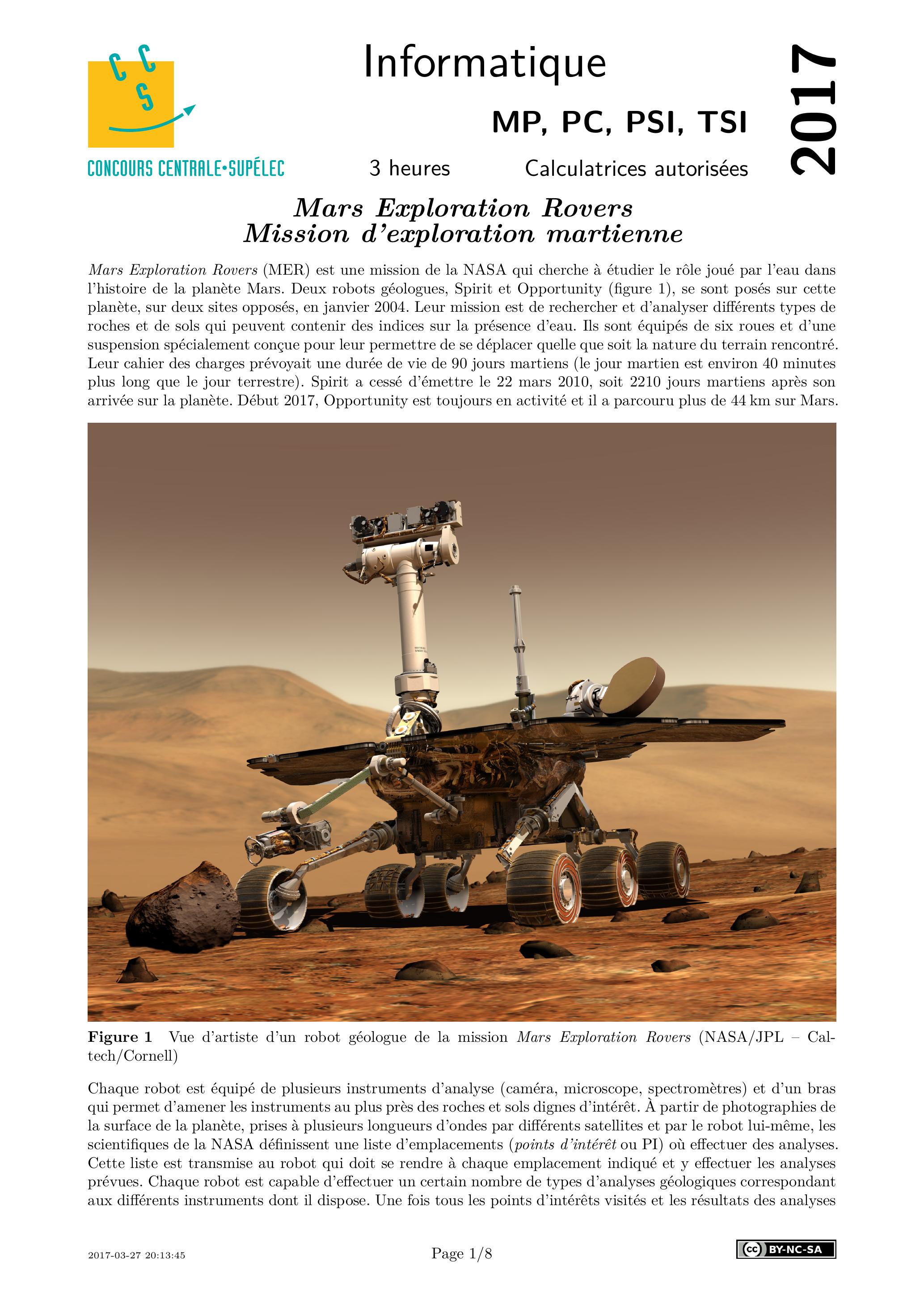 Mars Exploration Rovers (MER) est une mission de la NASA qui cherche à étudier le rôle joué par l'eau dans l'histoire de la planète Mars. Deux robots géologues, Spirit et Opportunity (figure 1), se sont posés sur cette planète, sur deux sites opposés, en janvier 2004. Leur mission est de rechercher et d'analyser différents types de roches et de sols qui peuvent contenir des indices sur la présence d'eau. Ils sont équipés de six roues et d'une suspension spécialement conçue pour leur permettre de se déplacer quelle que soit la nature du terrain rencontré. Leur cahier des charges prévoyait une durée de vie de 90 jours martiens (le jour martien est environ 40 minutes plus long que le jour terrestre). Spirit a cessé d'émettre le 22 mars 2010 , soit 2210 jours martiens après son arrivée sur la planète. Début 2017, Opportunity est toujours en activité et il a parcouru plus de 44 km sur Mars.
