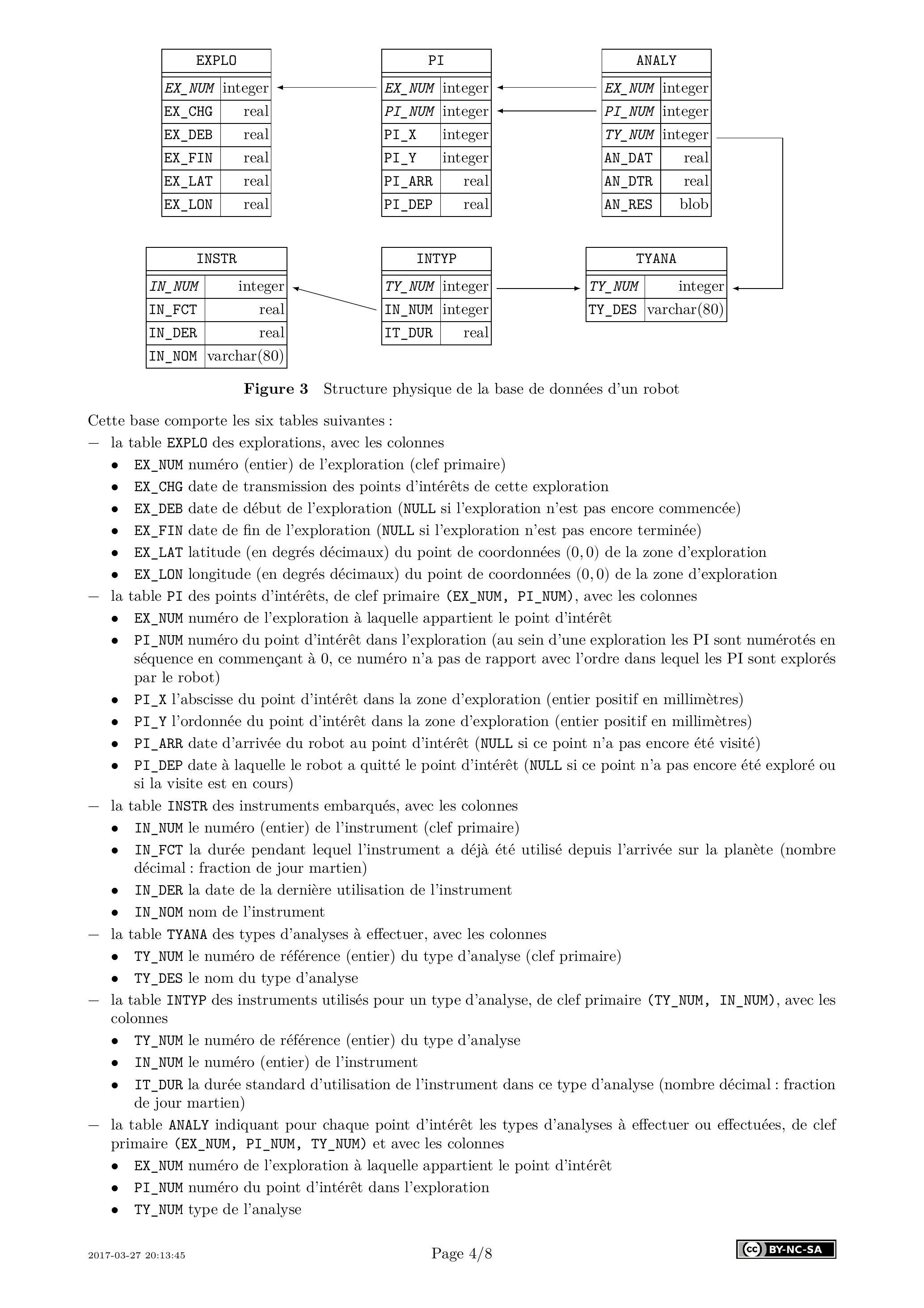 de la zone d'exploration - la table PI des points d'intérêts, de clef primaire (EX_NUM, PI_NUM), avec les colonnes