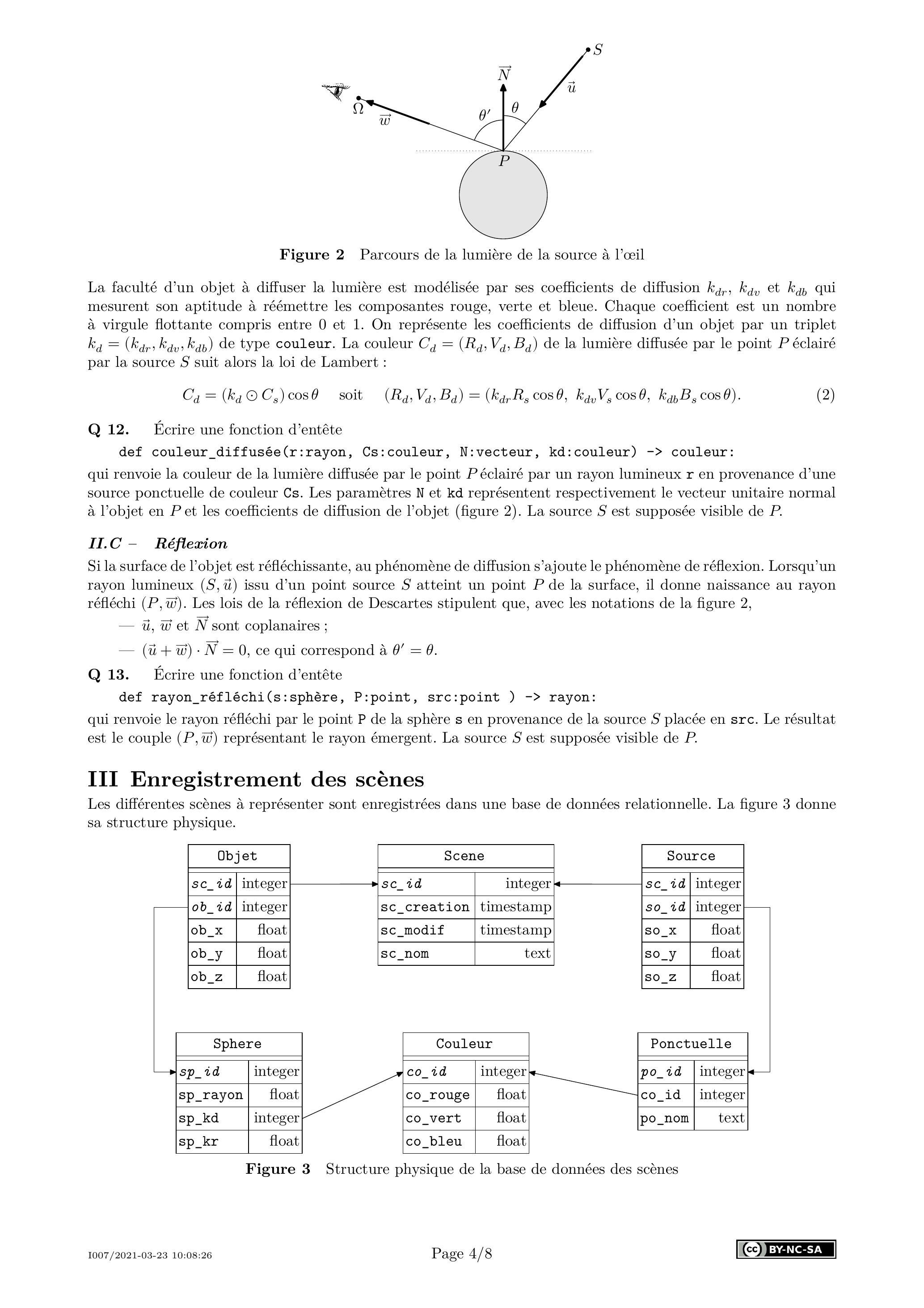 On considère un point d'un objet de la scène atteint par un rayon issu de l'œil. On note le point de l'écran coupé par ce rayon allant de l'œil au point . La couleur diffusée par est la somme des couleurs diffusées par ce point, dues à l'éclairement des sources visibles du point .