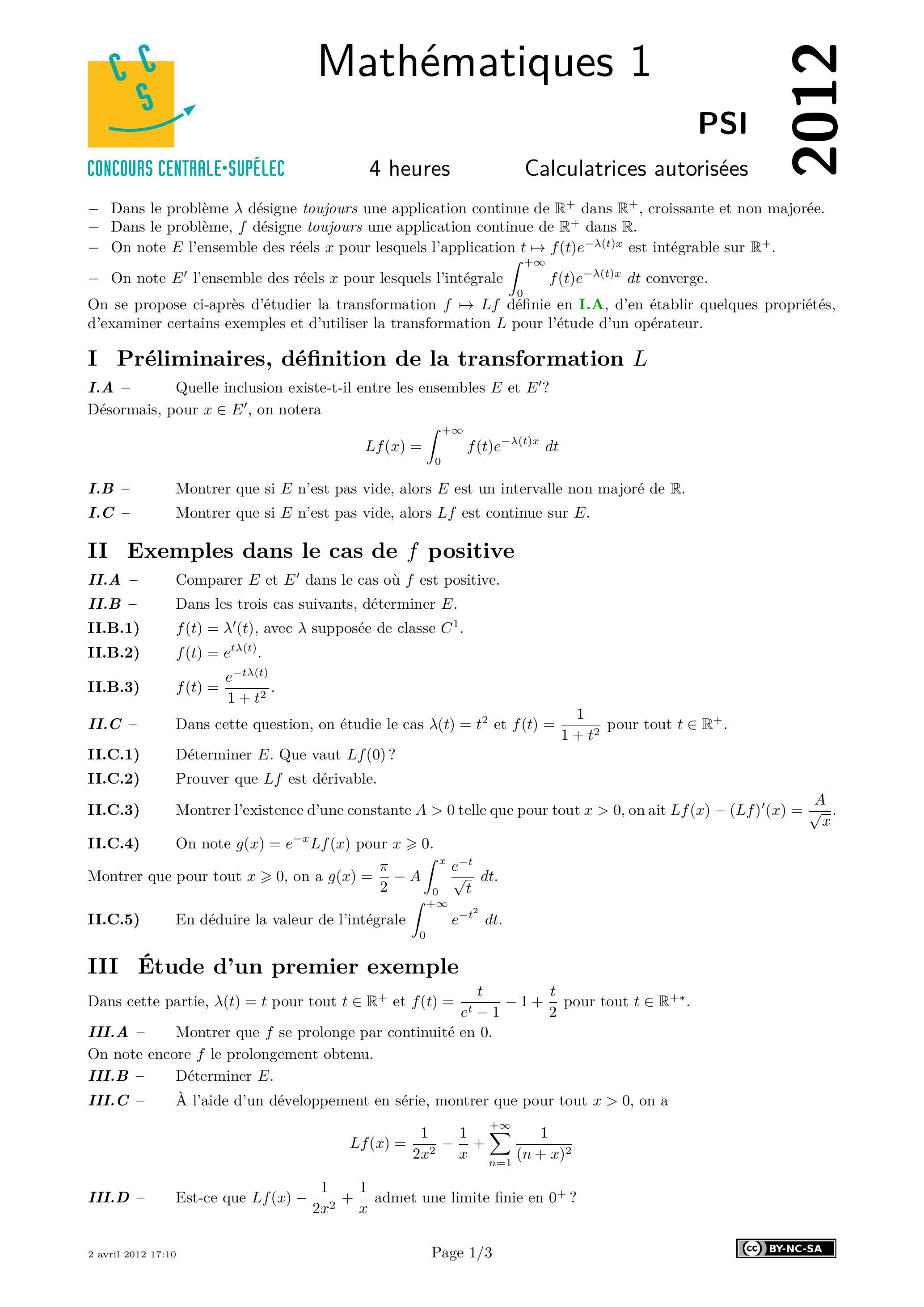 Centrale Mathématiques 1 PSI 2012 - Version Web LaTeX | WikiPrépa | WikiPrépa