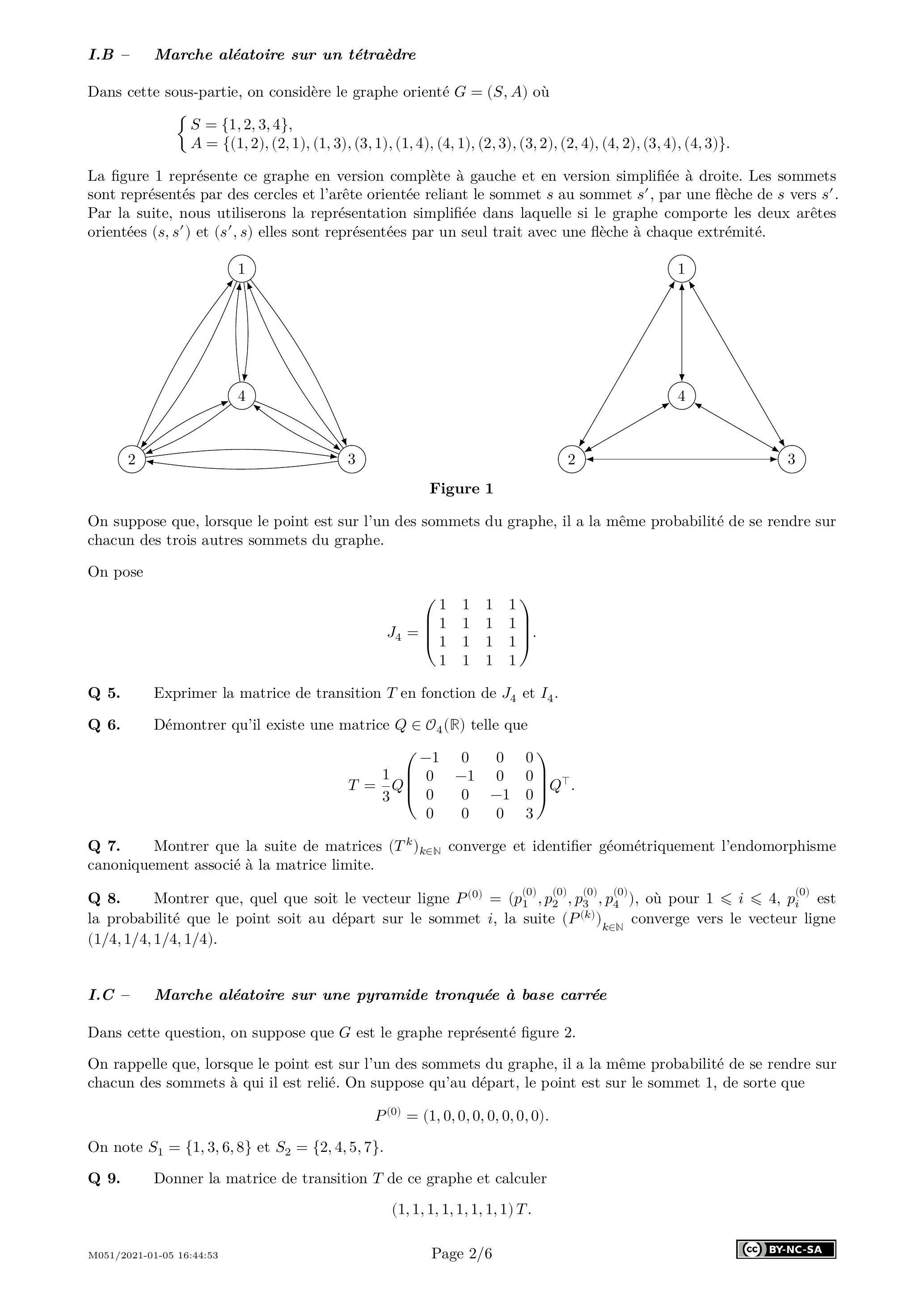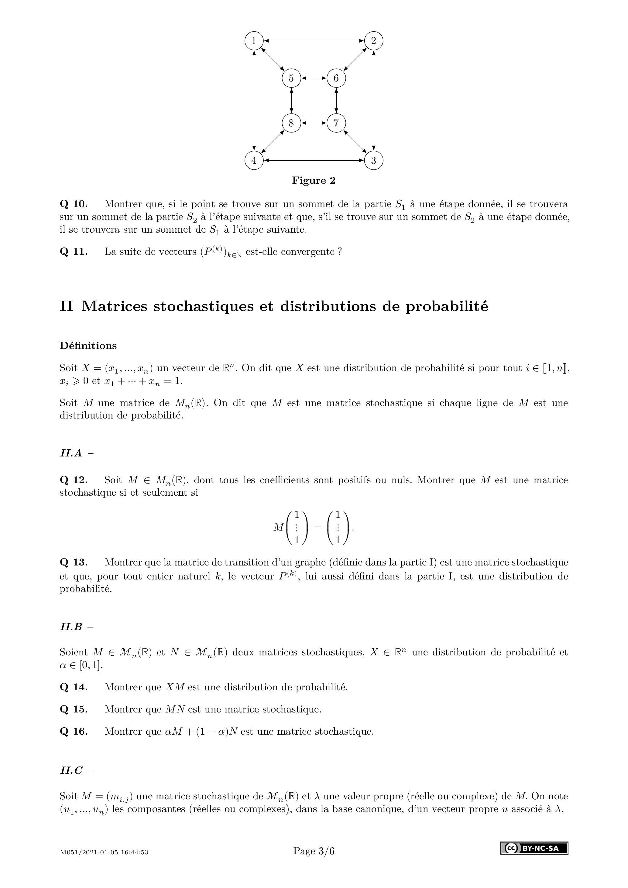 Q 13. Montrer que la matrice de transition d'un graphe (définie dans la partie I) est une matrice stochastique et que, pour tout entier naturel , le vecteur , lui aussi défini dans la partie I , est une distribution de probabilité.