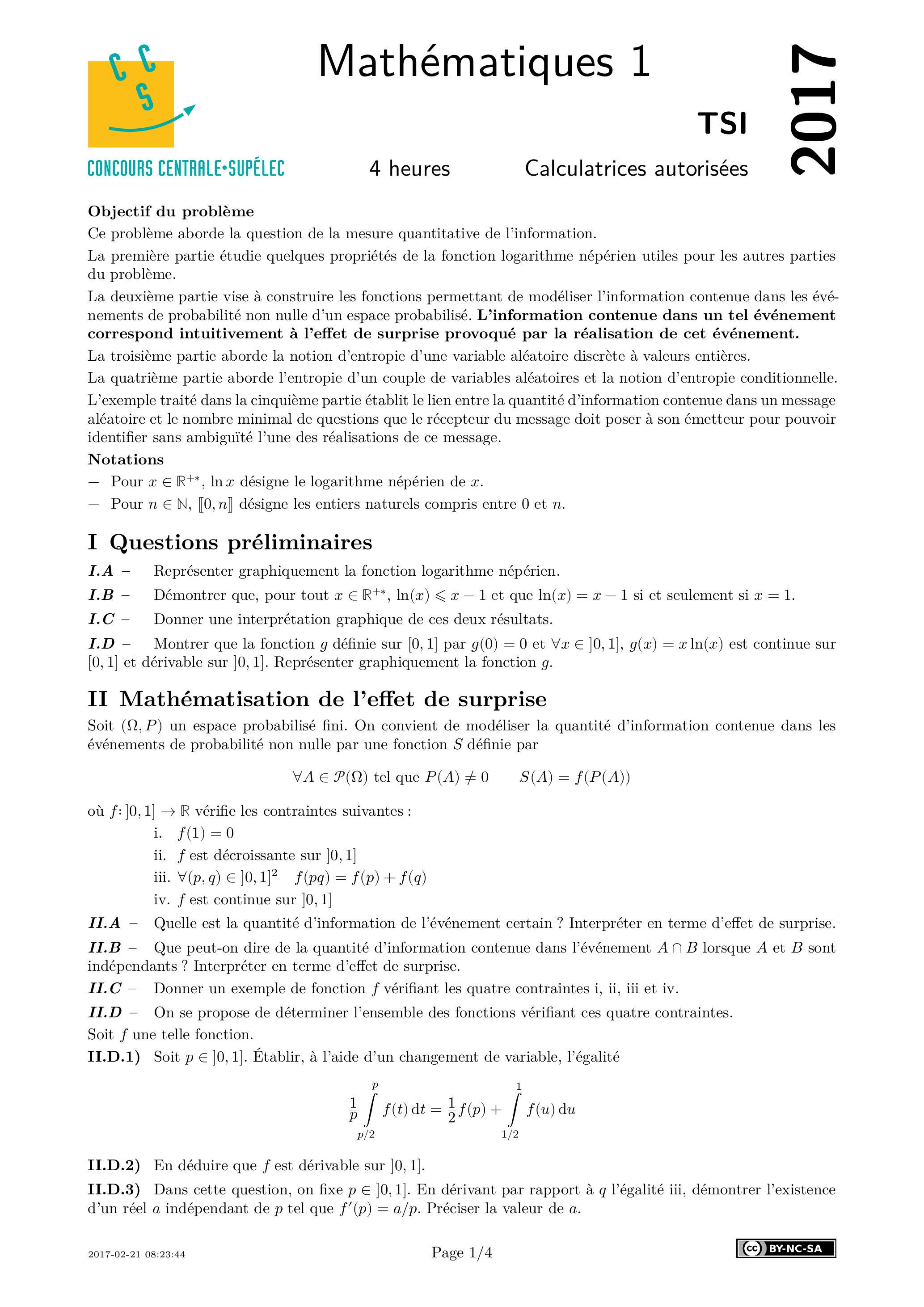 Centrale Mathématiques 1 TSI 2017