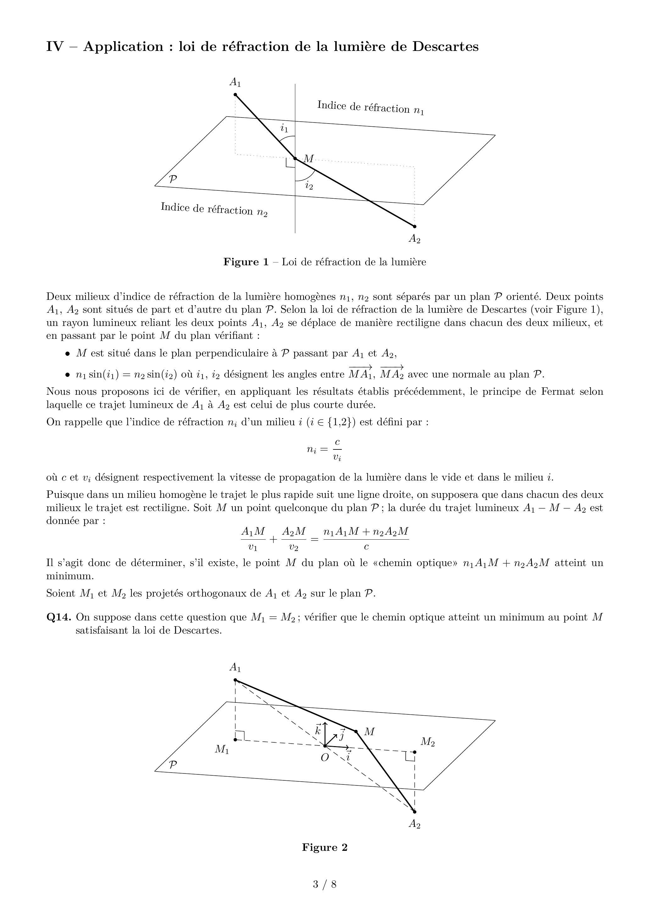 Q14. On suppose dans cette question que ; vérifier que le chemin optique atteint un minimum au point satisfaisant la loi de Descartes.