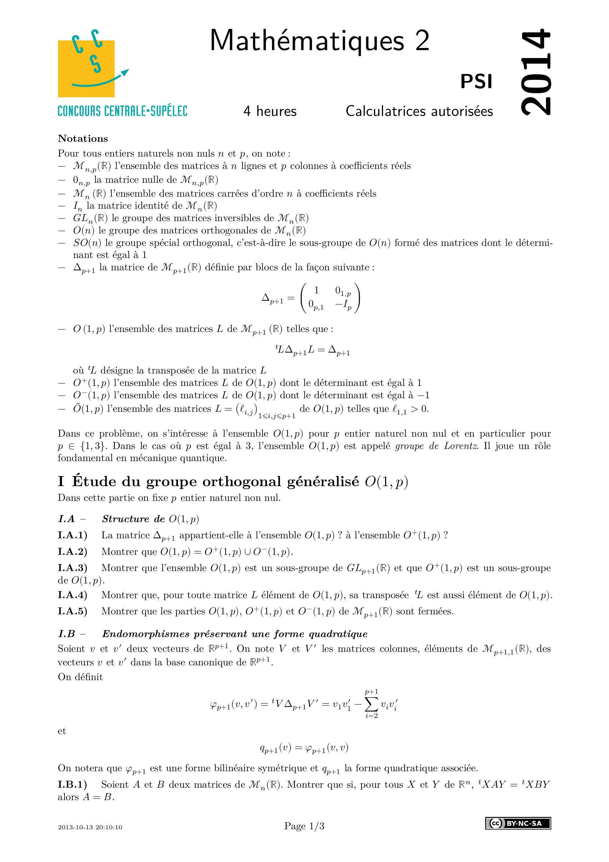 Dans ce problème, on s'intéresse à l'ensemble pour entier naturel non nul et en particulier pour . Dans le cas où est égal à 3 , l'ensemble est appelé groupe de Lorentz. Il joue un rôle fondamental en mécanique quantique.