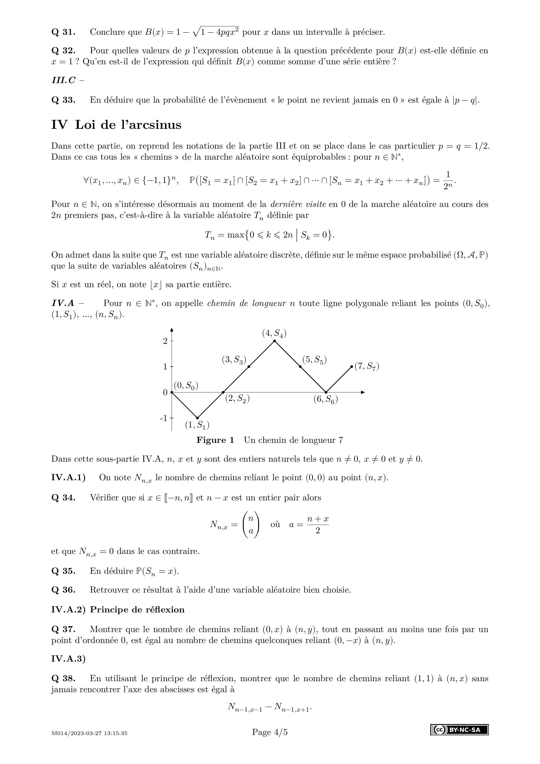 Dans cette partie, on reprend les notations de la partie III et on se place dans le cas particulier . Dans ce cas tous les «chemins » de la marche aléatoire sont équiprobables : pour ,