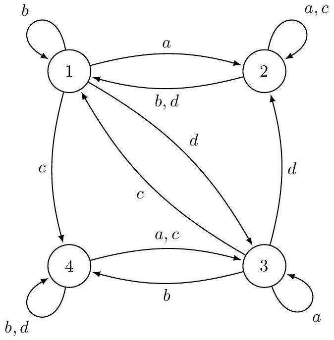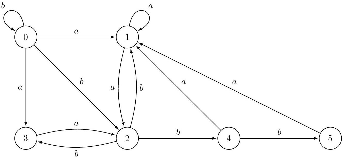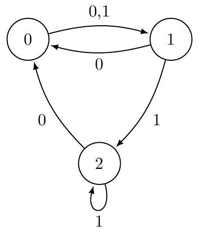 - On considère la machine représentée figure 3. Donner un mot synchronisant de trois lettres pour . On ne demande pas de justifier sa réponse.