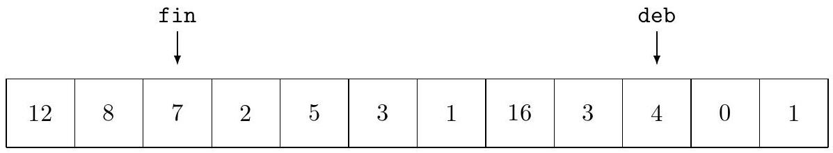 deb indique l'indice du premier élément dans la file et fin l'indice qui suit celui du dernier élément de la file, vide indiquant si la file est vide. Les éléments sont rangés depuis la case deb jusqu'à la case précédent fin en repartant à la case 0 quand on arrive au bout du vecteur (cf exemple). Ainsi, on peut très bien avoir l'indice fin plus petit que l'indice deb. Par exemple, la file figure 5 contient les éléments et 8 , dans cet ordre, avec et deb .