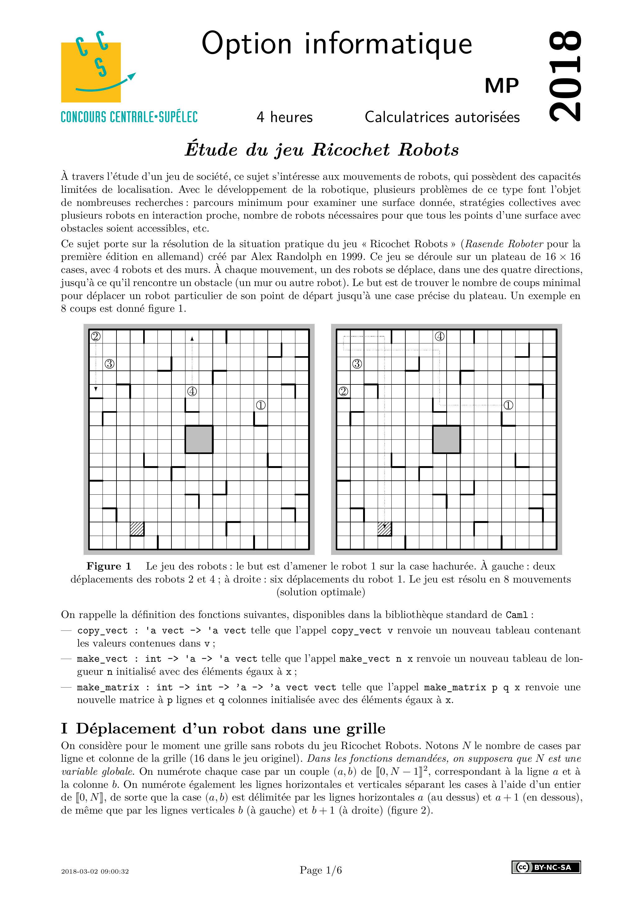 Ce sujet porte sur la résolution de la situation pratique du jeu «Ricochet Robots» (Rasende Roboter pour la première édition en allemand) créé par Alex Randolph en 1999. Ce jeu se déroule sur un plateau de cases, avec 4 robots et des murs. À chaque mouvement, un des robots se déplace, dans une des quatre directions, jusqu'à ce qu'il rencontre un obstacle (un mur ou autre robot). Le but est de trouver le nombre de coups minimal pour déplacer un robot particulier de son point de départ jusqu'à une case précise du plateau. Un exemple en 8 coups est donné figure 1.