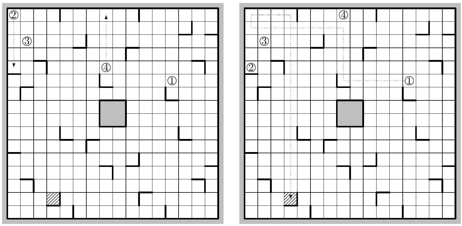 Figure 1 Le jeu des robots : le but est d'amener le robot 1 sur la case hachurée. À gauche : deux déplacements des robots 2 et 4 ; à droite : six déplacements du robot 1 . Le jeu est résolu en 8 mouvements (solution optimale)