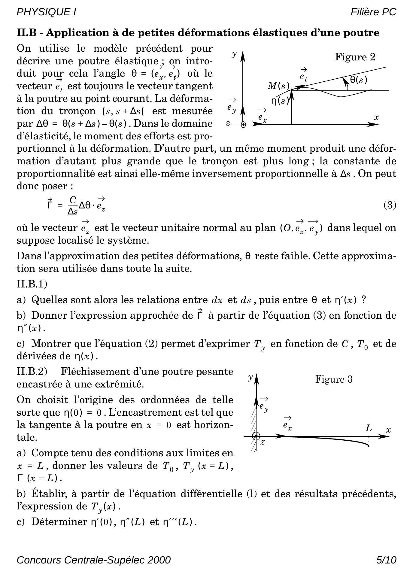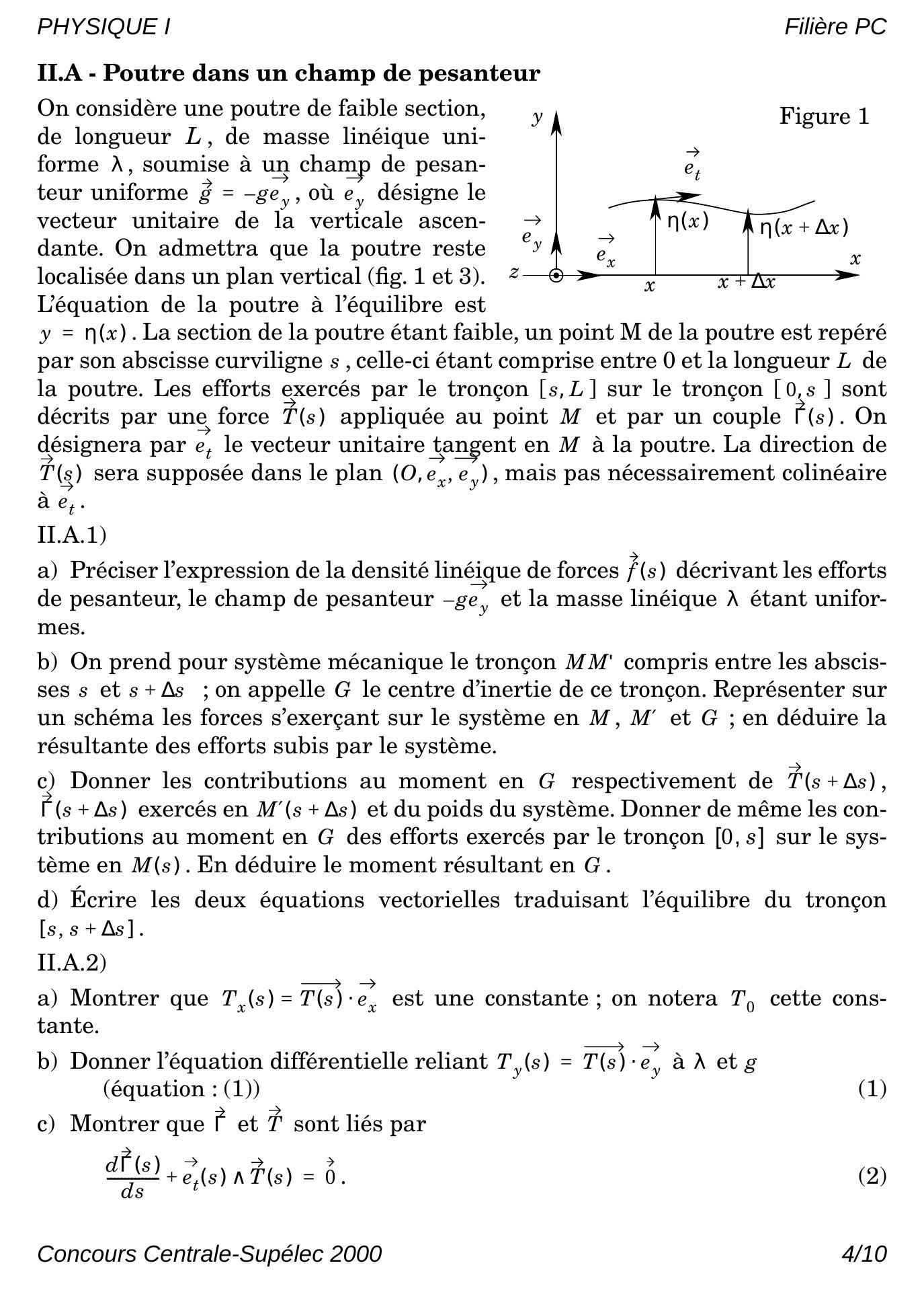 On considère une poutre de faible section, de longueur , de masse linéique uniforme , soumise à un champ de pesanteur uniforme , où désigne le vecteur unitaire de la verticale ascendante. On admettra que la poutre reste localisée dans un plan vertical (fig. 1 et 3 ). L'équation de la poutre à l'équilibre est . La section de la poutre étant faible, un point de la poutre est repéré par son abscisse curviligne , celle-ci étant comprise entre 0 et la longueur de la poutre. Les efforts exercés par le tronçon [ ] sur le tronçon [ ] sont décrits par une force appliquée au point et par un couple . On désignera par le vecteur unitaire tangent en à la poutre. La direction de sera supposée dans le plan ( ), mais pas nécessairement colinéaire à .