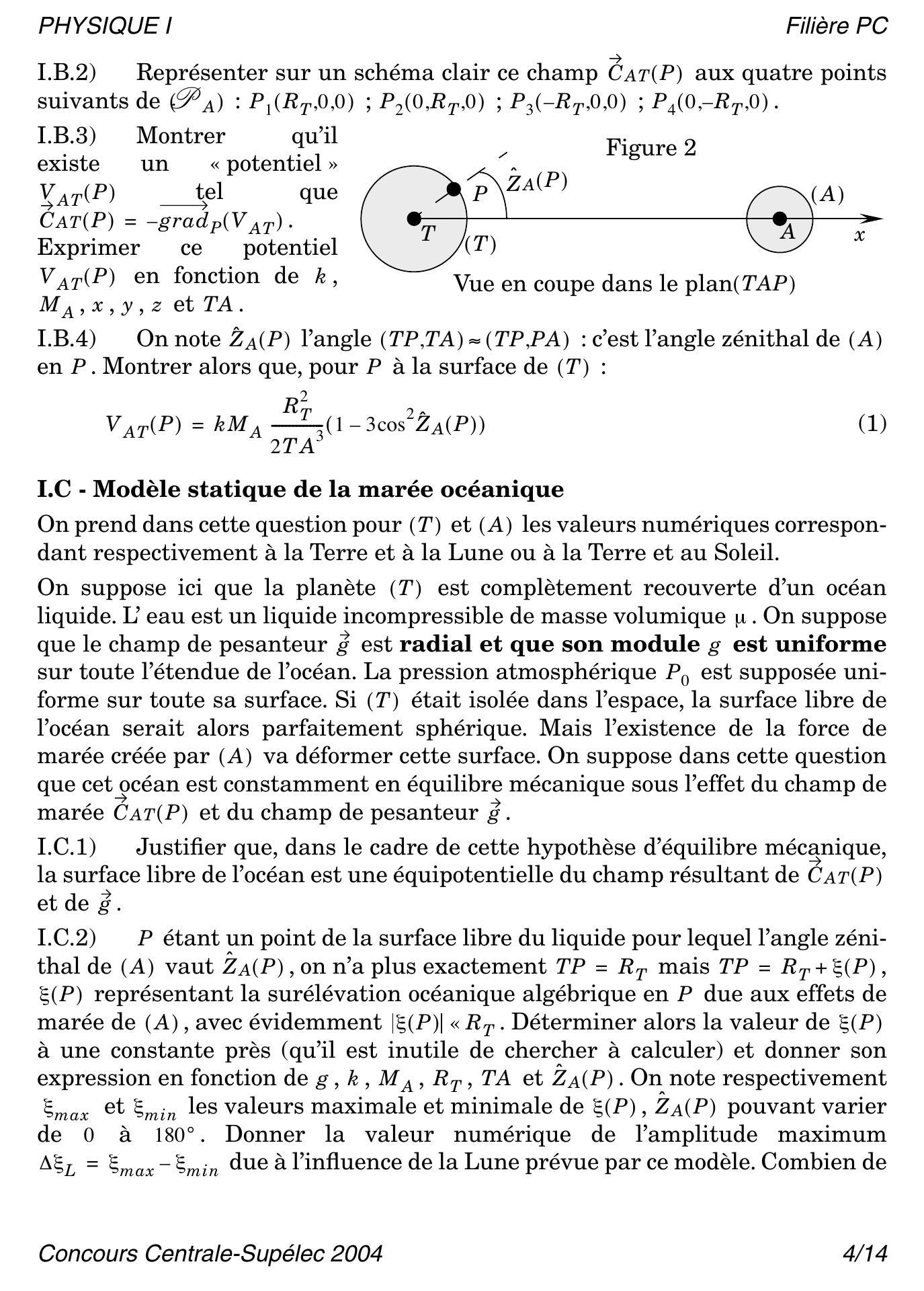 I.C.1) Justifier que, dans le cadre de cette hypothèse d'équilibre mécanique, la surface libre de l'océan est une équipotentielle du champ résultant de et de .