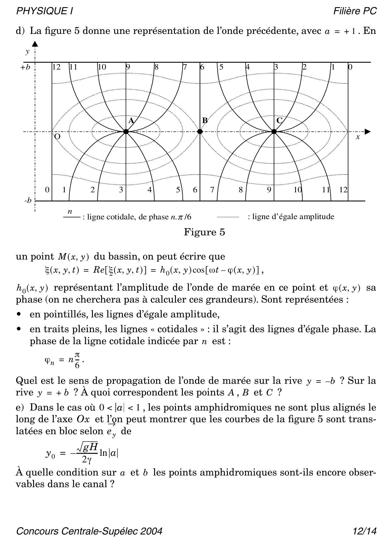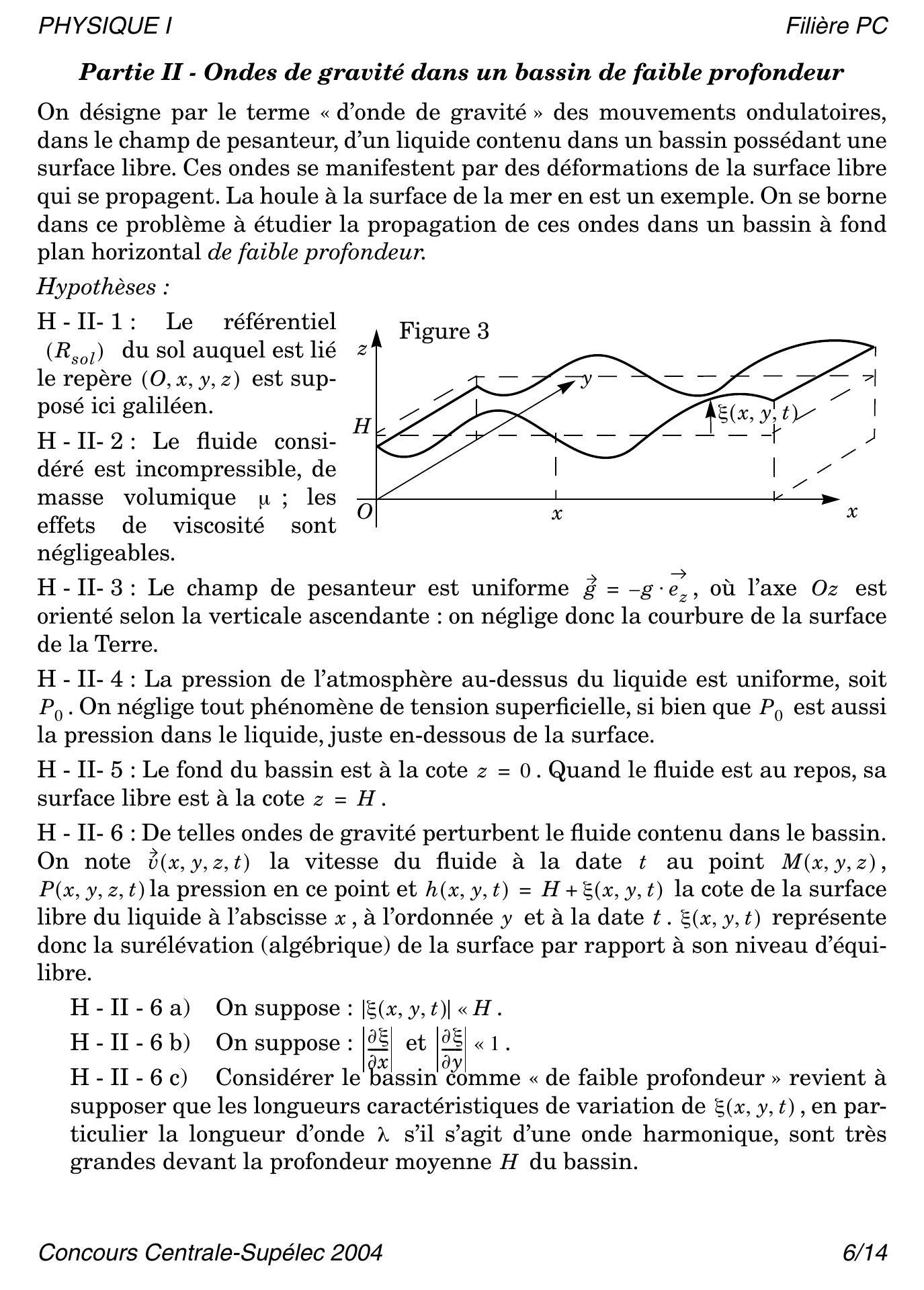 On désigne par le terme «d'onde de gravité» des mouvements ondulatoires, dans le champ de pesanteur, d'un liquide contenu dans un bassin possédant une surface libre. Ces ondes se manifestent par des déformations de la surface libre qui se propagent. La houle à la surface de la mer en est un exemple. On se borne dans ce problème à étudier la propagation de ces ondes dans un bassin à fond plan horizontal de faible profondeur.