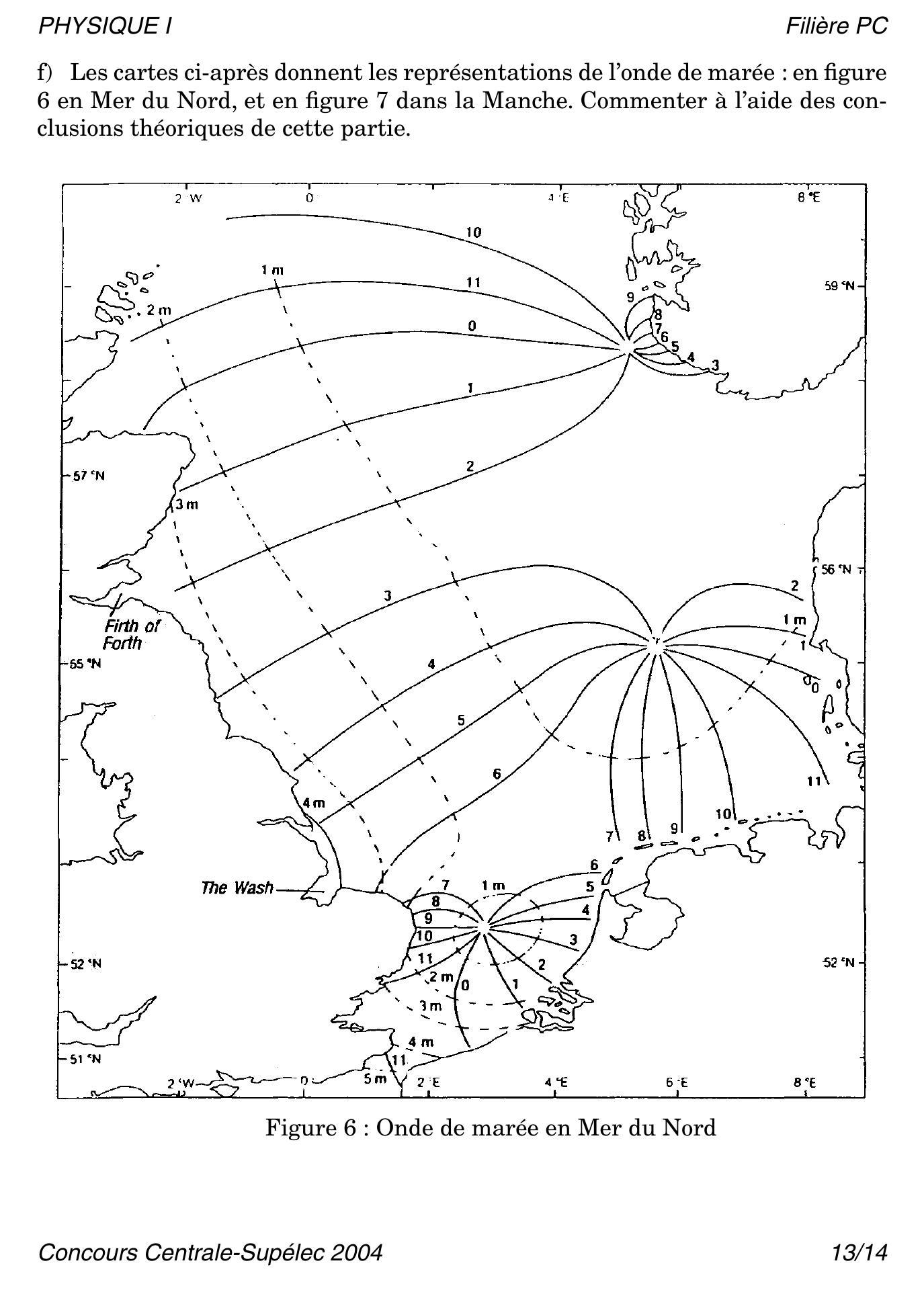 f) Les cartes ci-après donnent les représentations de l'onde de marée : en figure 6 en Mer du Nord, et en figure 7 dans la Manche. Commenter à l'aide des conclusions théoriques de cette partie.