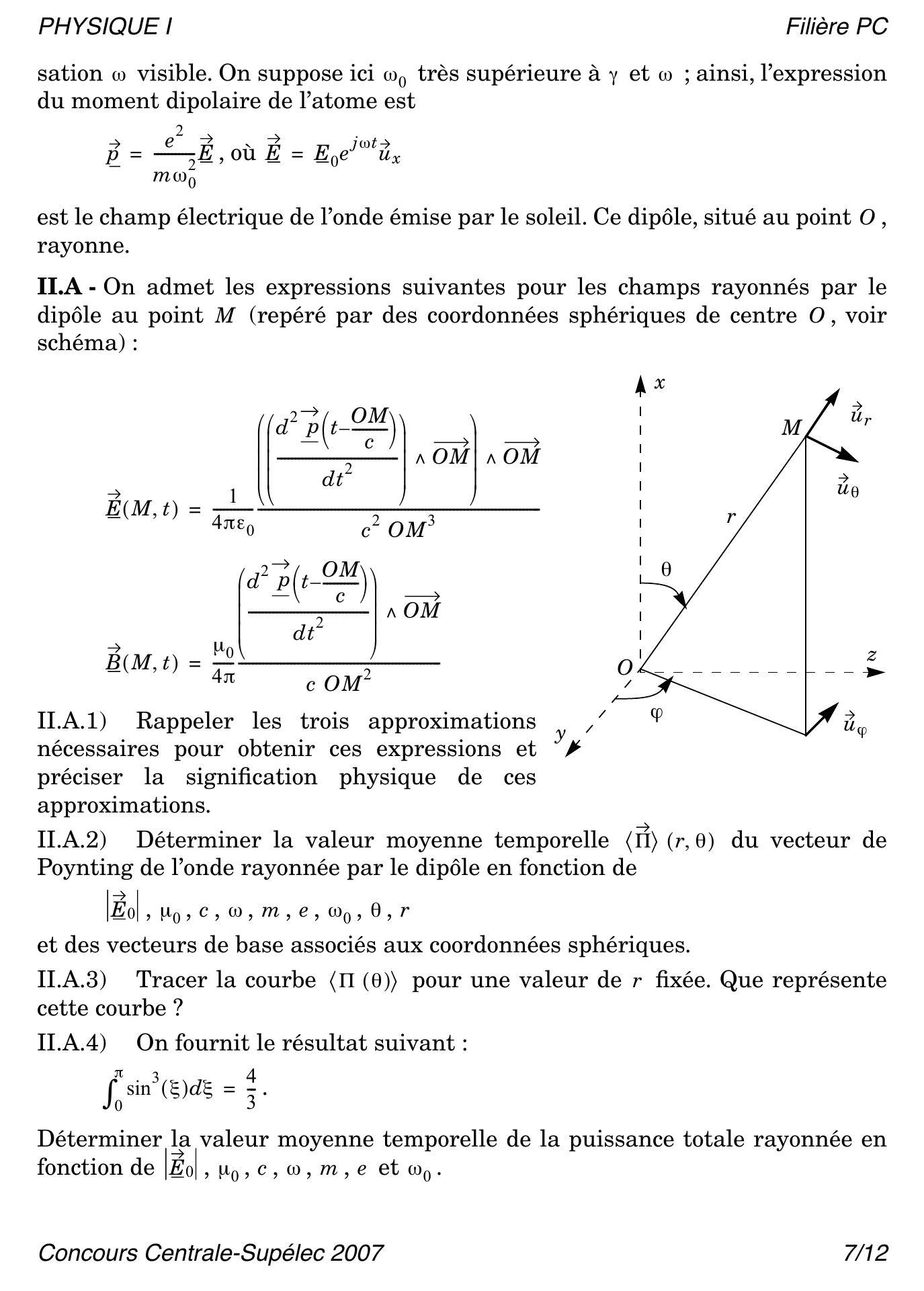 II.A - On admet les expressions suivantes pour les champs rayonnés par le dipôle au point (repéré par des coordonnées sphériques de centre , voir schéma) :
