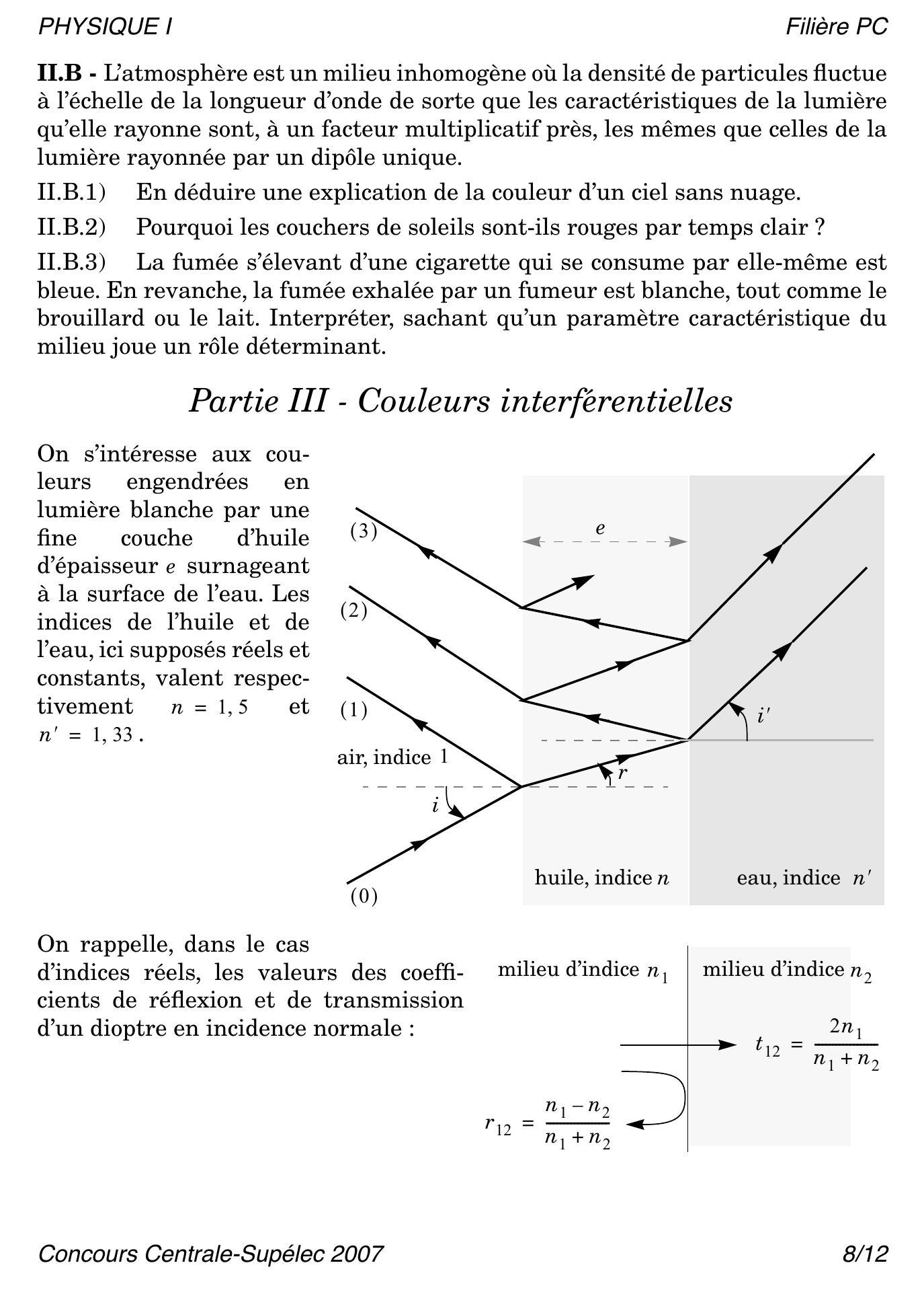 Le problème étudie l'interprétation de certains phénomènes colorés de la vie quotidienne. L'usage de tout type de machine à calculer est autorisé mais inutile pour cette épreuve. Les applications numériques ne portent que sur des ordres de grandeur aisément déterminables «à la main». Les différentes parties sont largement indépendantes. Tout résultat fourni par l'énoncé pourra être utilisé dans la suite sans justification.