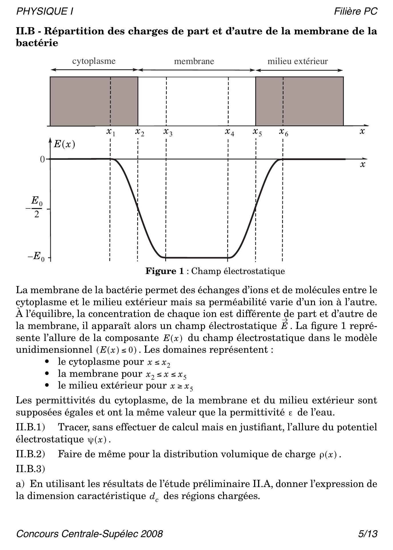 La membrane de la bactérie permet des échanges d'ions et de molécules entre le cytoplasme et le milieu extérieur mais sa perméabilité varie d'un ion à l'autre. À l'équilibre, la concentration de chaque ion est différente de part et d'autre de la membrane, il apparaît alors un champ électrostatique . La figure 1 représente l'allure de la composante du champ électrostatique dans le modèle unidimensionnel . Les domaines représentent: