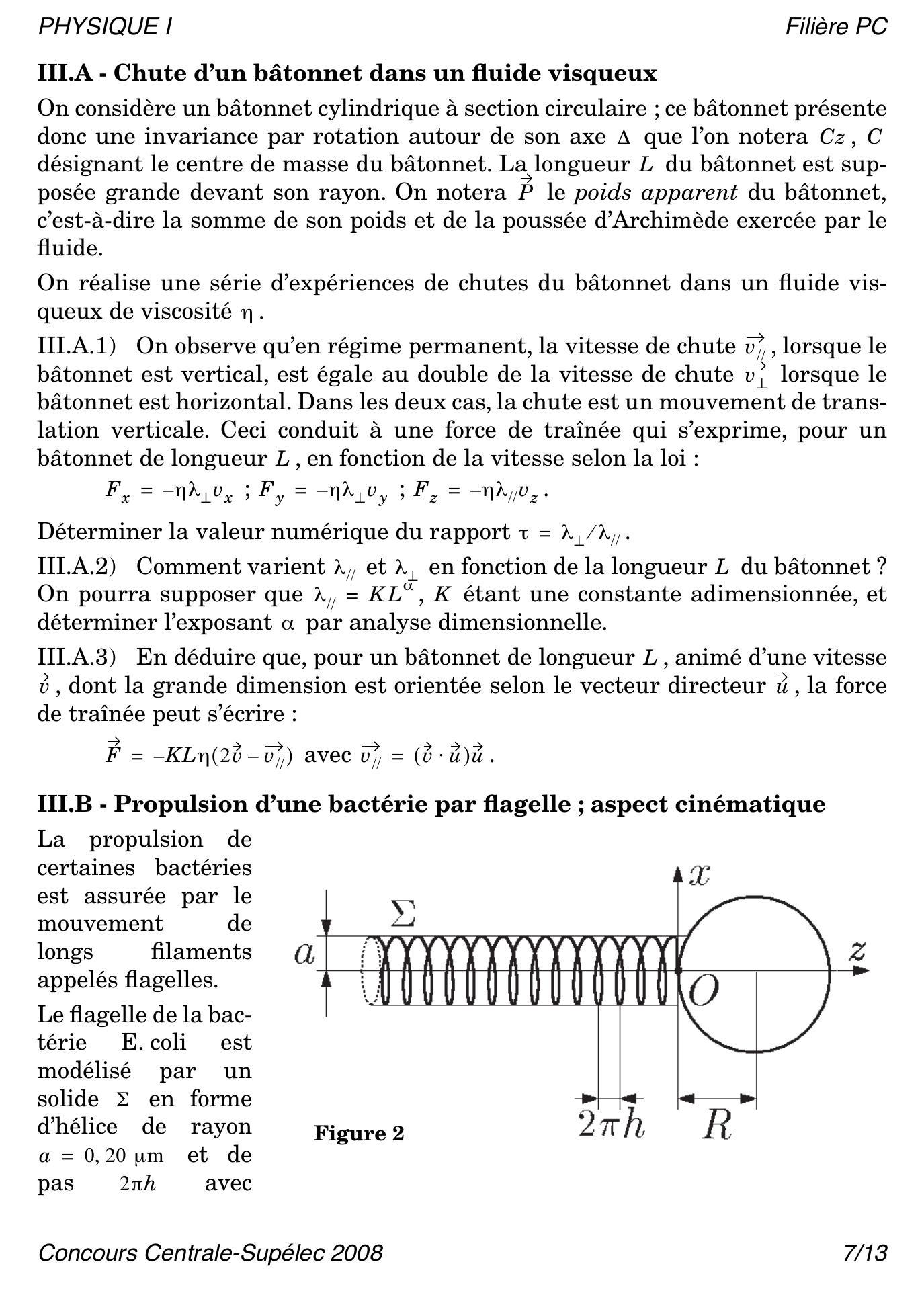 III.A.1) On observe qu'en régime permanent, la vitesse de chute , lorsque le bâtonnet est vertical, est égale au double de la vitesse de chute lorsque le bâtonnet est horizontal. Dans les deux cas, la chute est un mouvement de translation verticale. Ceci conduit à une force de traînée qui s'exprime, pour un bâtonnet de longueur , en fonction de la vitesse selon la loi: