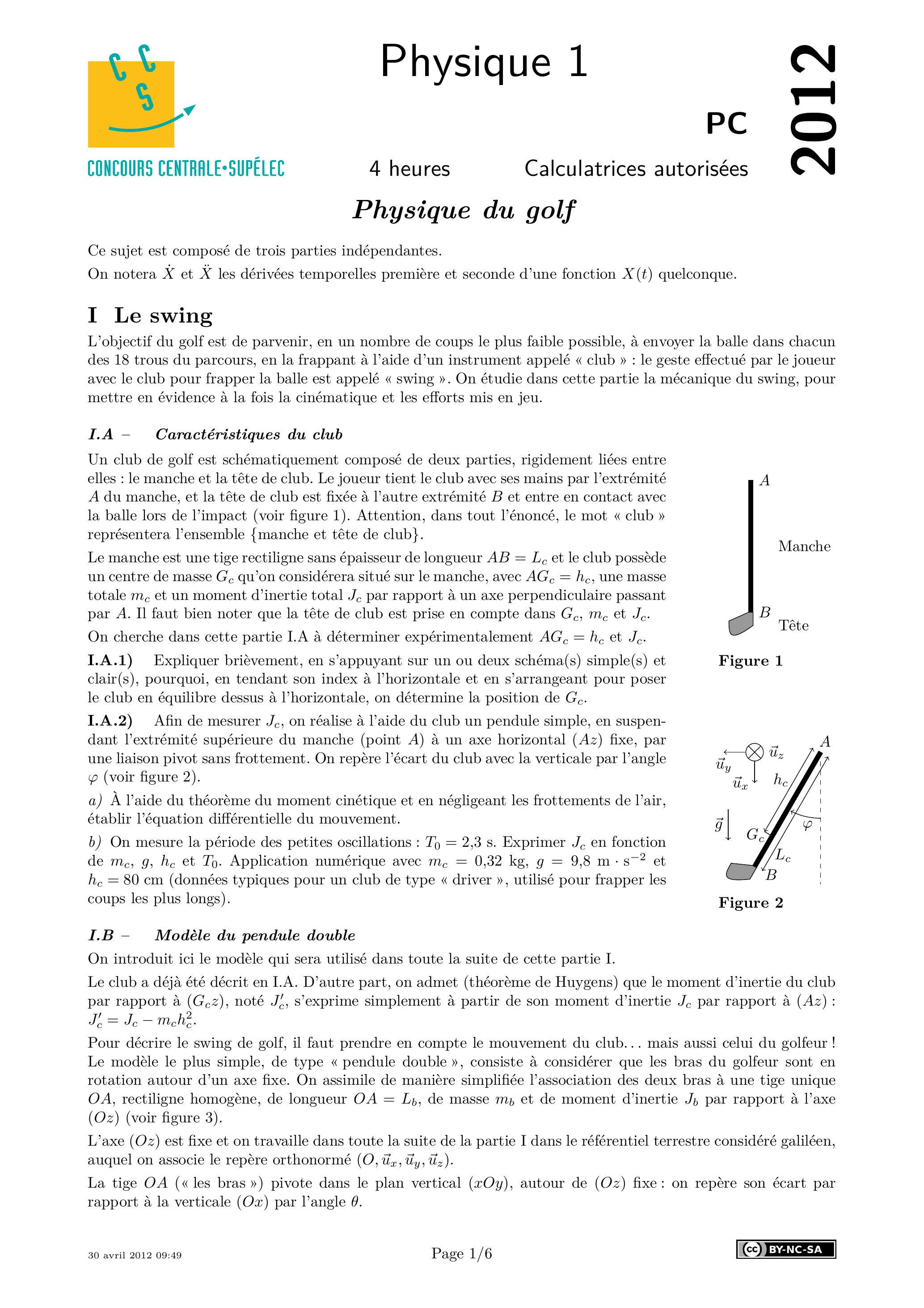 Un club de golf est schématiquement composé de deux parties, rigidement liées entre elles : le manche et la tête de club. Le joueur tient le club avec ses mains par l'extrémité du manche, et la tête de club est fixée à l'autre extrémité et entre en contact avec la balle lors de l'impact (voir figure 1). Attention, dans tout l'énoncé, le mot «club » représentera l'ensemble {manche et tête de club}.