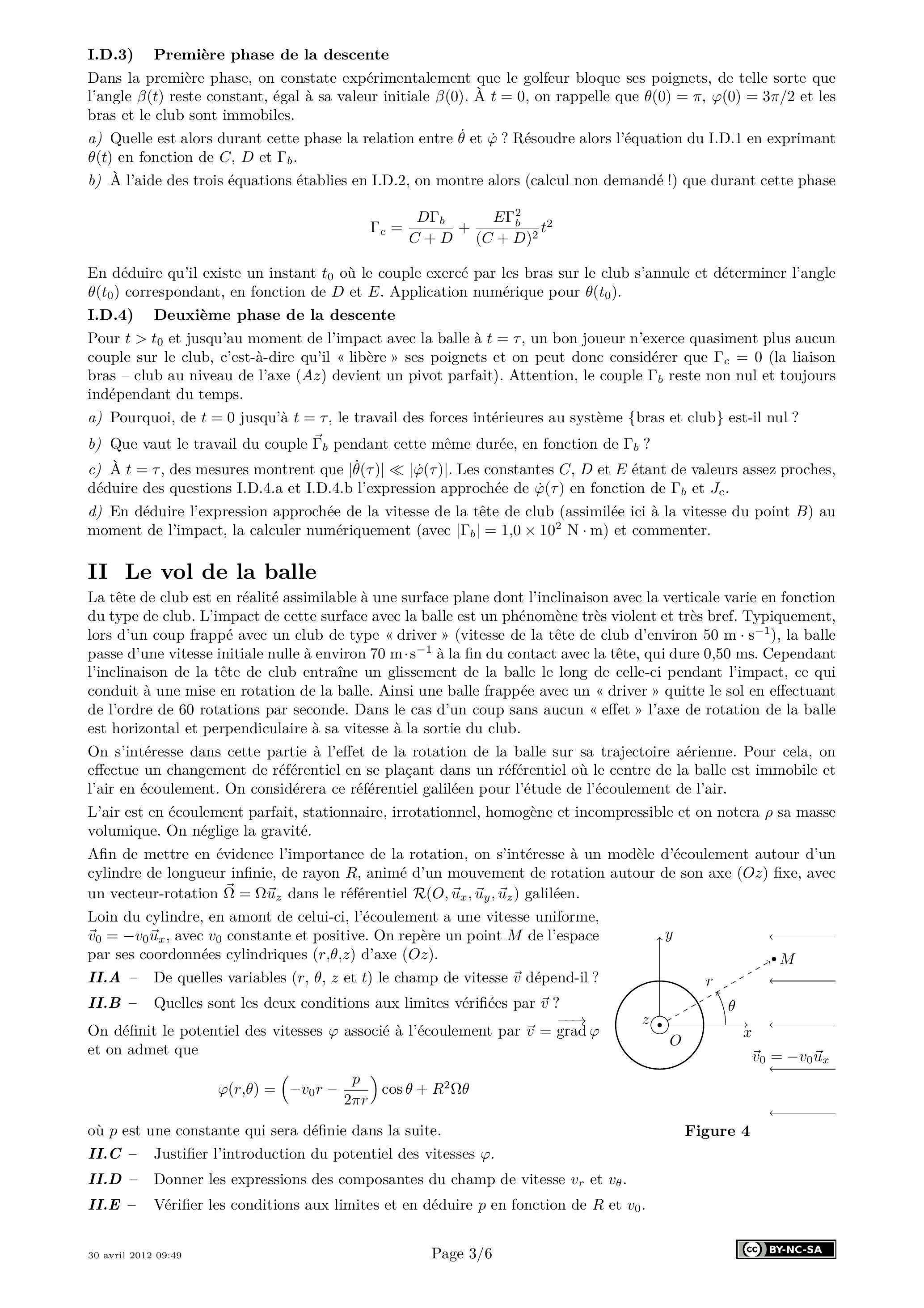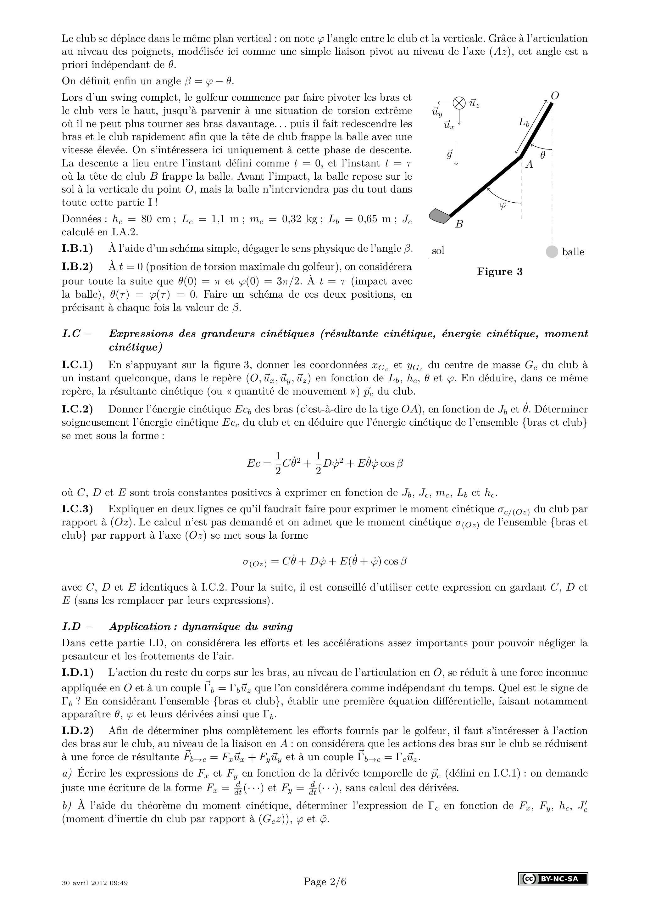 I.C.3) Expliquer en deux lignes ce qu'il faudrait faire pour exprimer le moment cinétique du club par rapport à . Le calcul n'est pas demandé et on admet que le moment cinétique de l'ensemble {bras et club} par rapport à l'axe (Oz) se met sous la forme