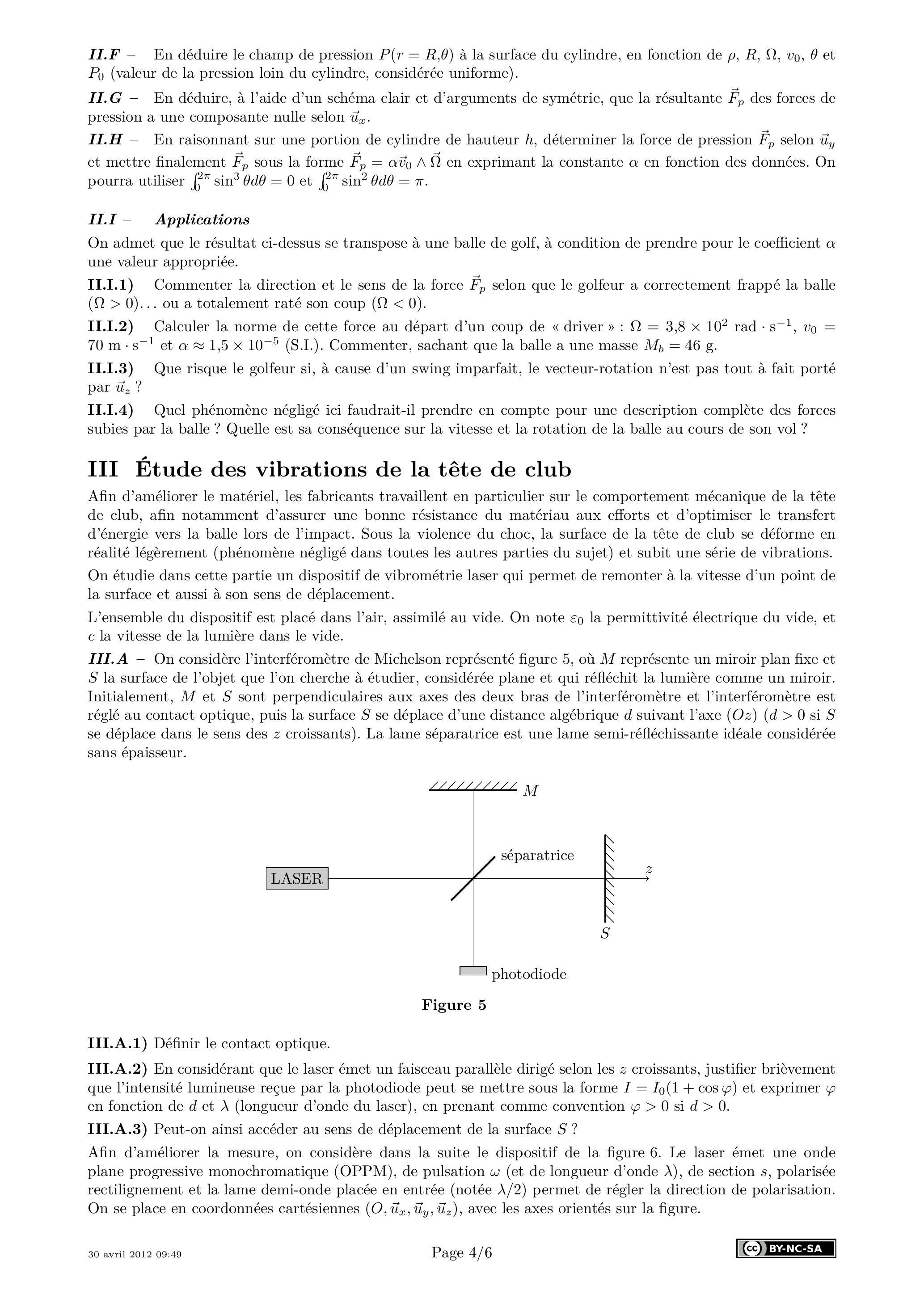 Afin d'améliorer le matériel, les fabricants travaillent en particulier sur le comportement mécanique de la tête de club, afin notamment d'assurer une bonne résistance du matériau aux efforts et d'optimiser le transfert d'énergie vers la balle lors de l'impact. Sous la violence du choc, la surface de la tête de club se déforme en réalité légèrement (phénomène négligé dans toutes les autres parties du sujet) et subit une série de vibrations. On étudie dans cette partie un dispositif de vibrométrie laser qui permet de remonter à la vitesse d'un point de la surface et aussi à son sens de déplacement.