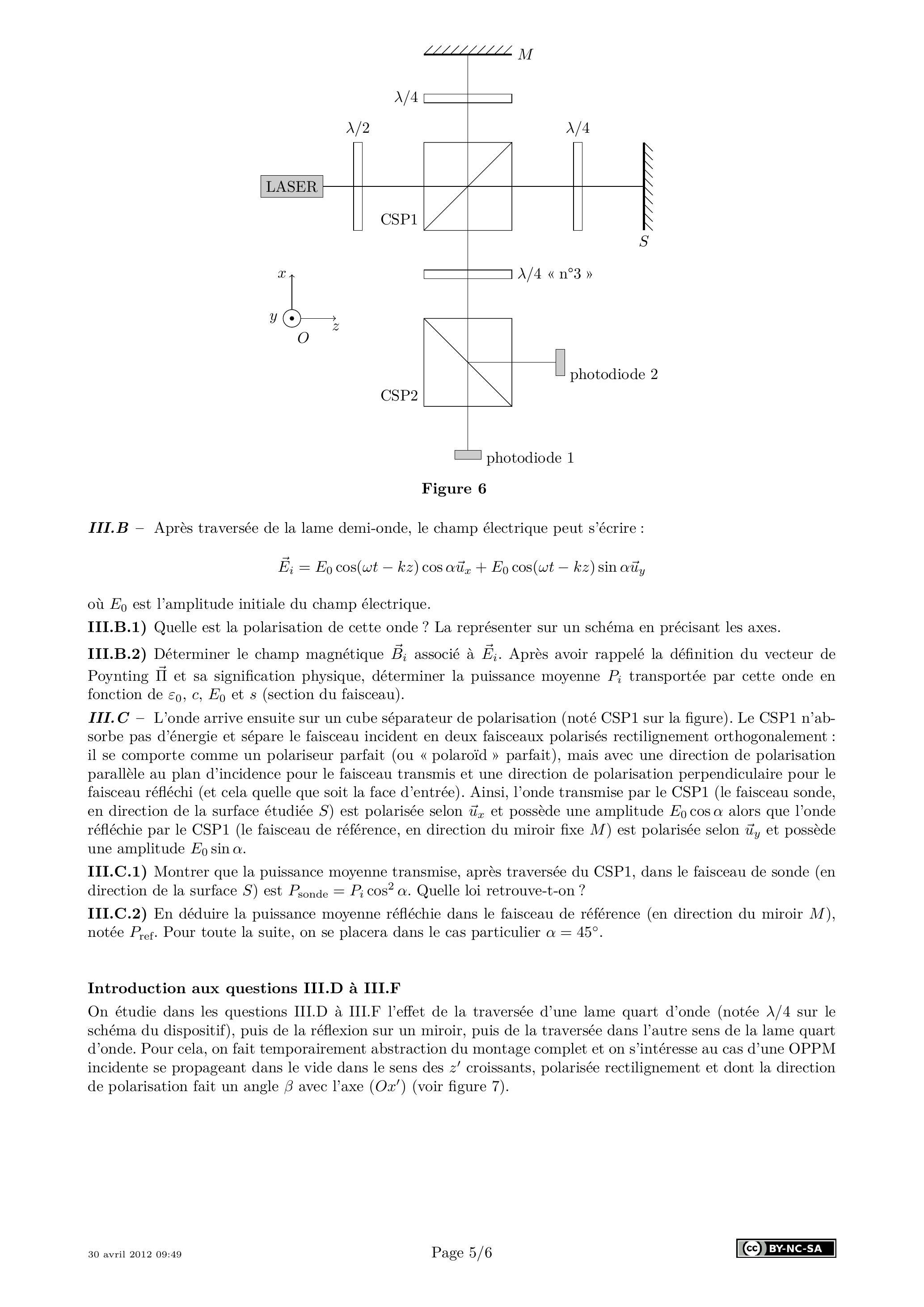 Afin d'améliorer la mesure, on considère dans la suite le dispositif de la figure 6. Le laser émet une onde plane progressive monochromatique (OPPM), de pulsation (et de longueur d'onde ), de section , polarisée rectilignement et la lame demi-onde placée en entrée (notée ) permet de régler la direction de polarisation. On se place en coordonnées cartésiennes ( ), avec les axes orientés sur la figure.