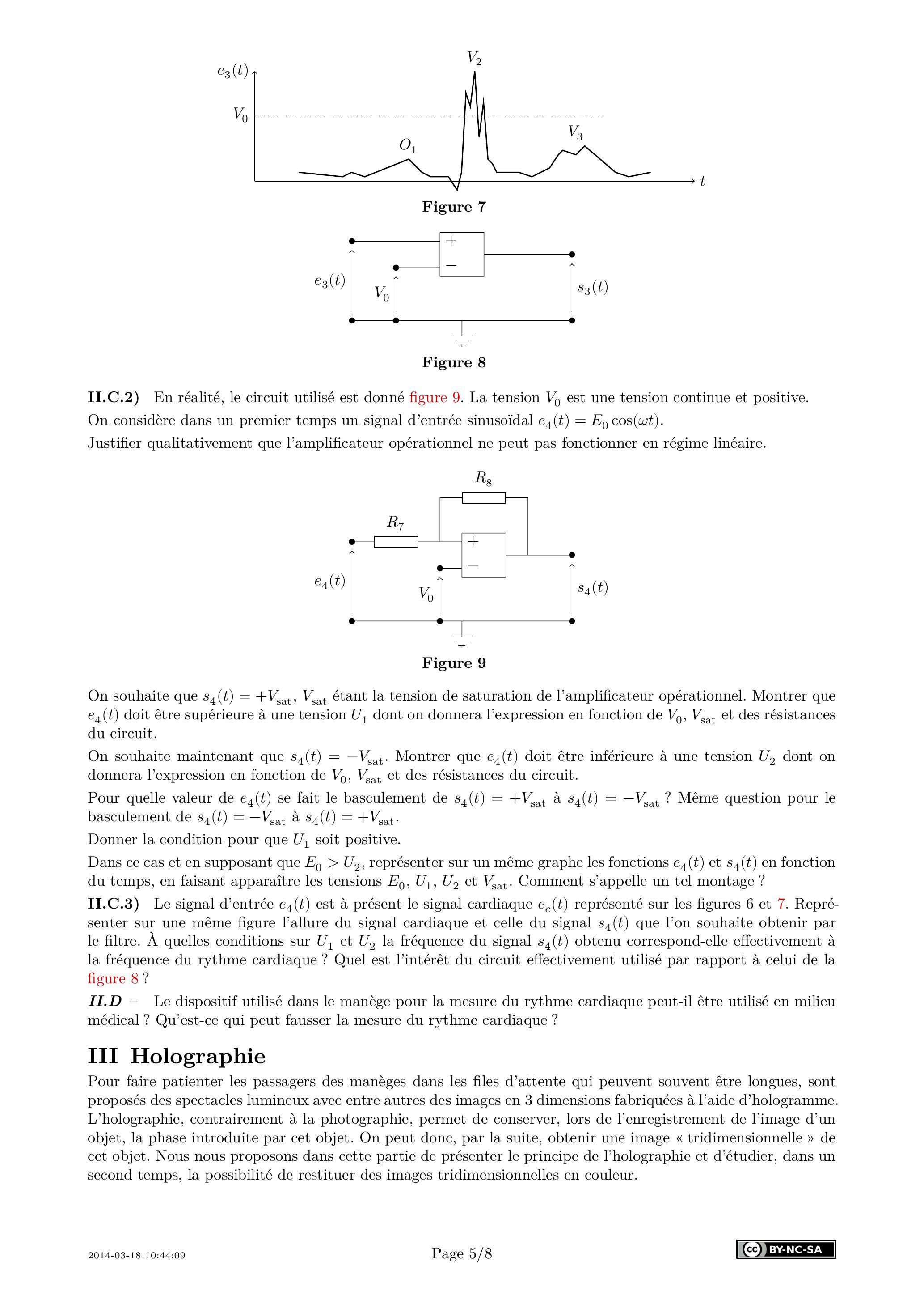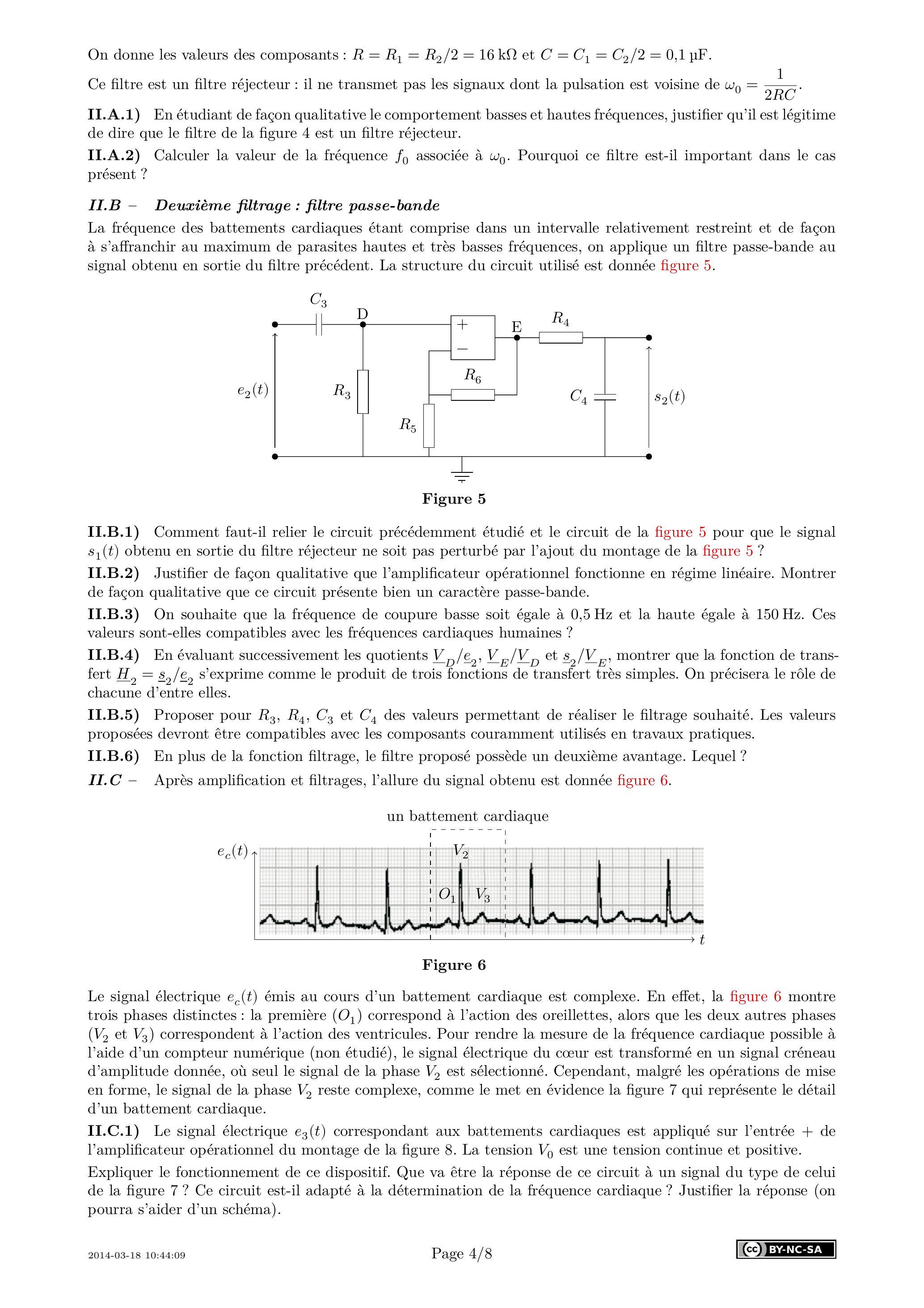 II.C.3) Le signal d'entrée est à présent le signal cardiaque représenté sur les figures 6 et 7 . Représenter sur une même figure l'allure du signal cardiaque et celle du signal que l'on souhaite obtenir par le filtre. À quelles conditions sur et la fréquence du signal obtenu correspond-elle effectivement à la fréquence du rythme cardiaque ? Quel est l'intérêt du circuit effectivement utilisé par rapport à celui de la figure 8 ?